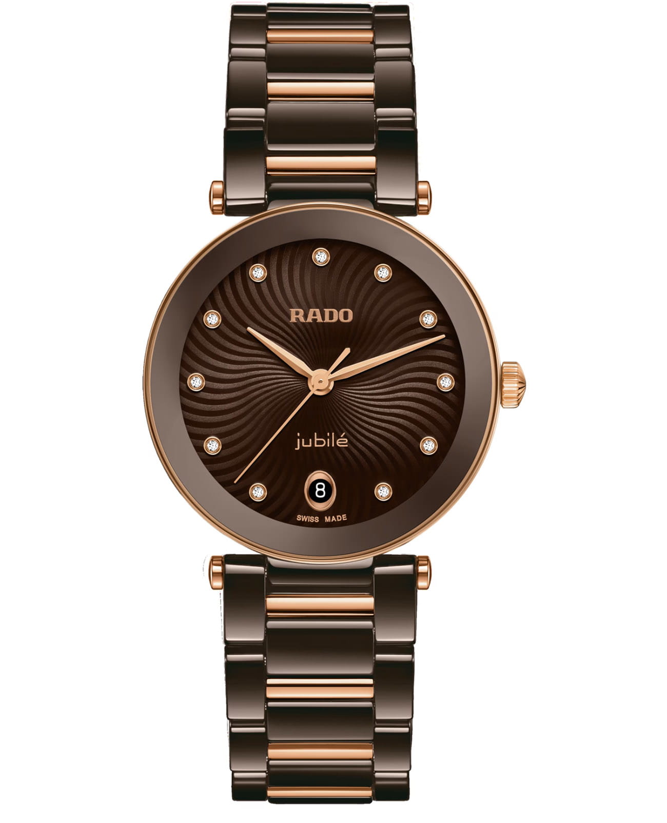Женские кварцевые часы Rado — это изысканный аксессуар с современным дизайном. Корпус диаметром 31 мм выполнен из высокотехнологичной керамикиВысокотехнологичная керамикаИнновационный запатентованный Rado материал с гладкой или матовой поверхностью. Керамика за счёт кристаллической структуры обладает повышенной устойчивостью от возникновения царапин. Материал способен принимать температуру тела человека, обеспечивая невероятный комфорт при ношении. и нержавеющей стали с PVD-покрытиемPVDУльтратонкое покрытие наносится в технике вакуумного напыления, сочетает в себе нитрид титана особой прочности со слоем золота или оксида хрома. Несёт в себе декоративную или защитную функцию. розового золота. Циферблат коричневого цвета оформлен аналоговым дисплеем. Циферблат защищён выпуклым сапфировым стекломСапфировое стеклоПрочный и надёжный материал из кристалла сапфира синтетического происхождения, характеризующийся особой твёрдостью и устойчивостью к царапинам и повреждениям.. Окошко даты расположено в положении 3 часов. Механизм — кварцевый. Часы оснащены браслетом из комбинации керамики и стали с PVD-покрытиемPVDУльтратонкое покрытие наносится в технике вакуумного напыления, сочетает в себе нитрид титана особой прочности со слоем золота или оксида хрома. Несёт в себе декоративную или защитную функцию. и застёжкой «бабочка» с кнопкамиЗастёжка "бабочка"Такой вид застёжки дополняется предохранителями, помогающими избежать случайного раскрытия браслета. Обладают изящным исполнением. . Водонепроницаемость 50 м позволяет использовать часы в повседневных условиях. Гарантия — 5 лет на механизм, 2 года на изделие. Идеальный выбор для тех, кто ценит стиль, качество и универсальность.