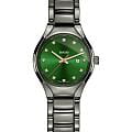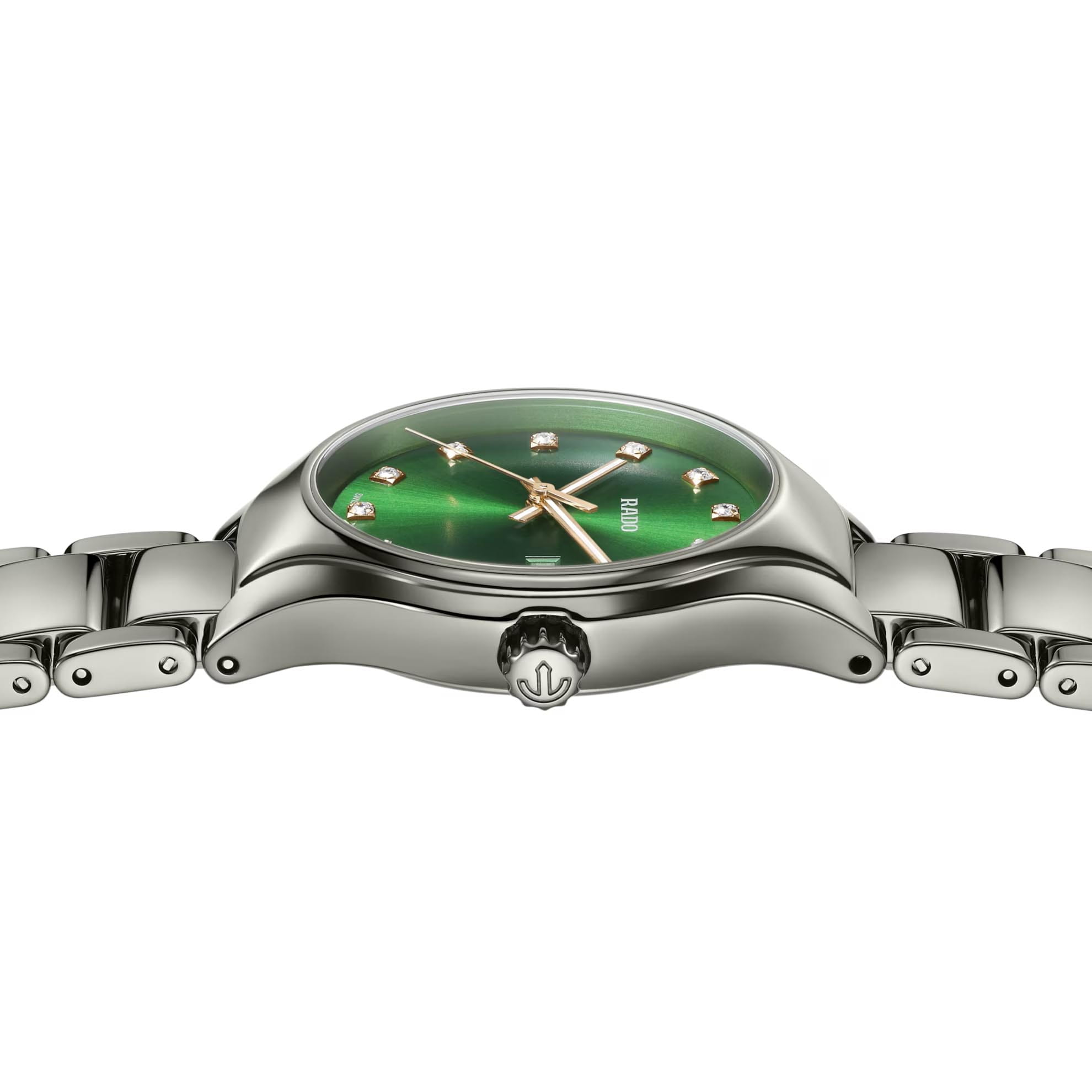 Женские кварцевые часы Rado True — это изысканный аксессуар с современным дизайном и высокотехнологичными материалами. Корпус диаметром 30 мм выполнен из цельного блока высокотехнологичной плазменной керамикиВысокотехнологичная плазменная керамикаИнновационный материал, технология запатентована. Выплавление керамики осуществляется в печи при 20 000 °C, белоснежный материал под воздействием ультравысокой температуры приобретает уникальный блеск, присущий металлам., что обеспечивает лёгкость, прочность и устойчивость к царапинам. Циферблат зелёного цвета украшен 12 бриллиантами и защищён выпуклым сапфировым стекломСапфировое стеклоПрочный и надёжный материал из кристалла сапфира синтетического происхождения, характеризующийся особой твёрдостью и устойчивостью к царапинам и повреждениям.. Стрелки розового золота с белым покрытием и метки снабжены люминесцентным покрытиемЛюминесцентное покрытиеПозволяет считывать показания времени в темноте. Производители наносят на стрелки, часовые индексы, безель или поверхность циферблата светонакопительный состав, дающий холодное свечение. Super-Luminova®, обеспечивающим отличную читаемость в темноте. Механизм — кварцевый. Часы оснащены браслетом из высокотехнологичной плазменной керамикиВысокотехнологичная плазменная керамикаИнновационный материал, технология запатентована. Выплавление керамики осуществляется в печи при 20 000 °C, белоснежный материал под воздействием ультравысокой температуры приобретает уникальный блеск, присущий металлам. и титана с застёжкой «бабочка» с кнопкамиЗастёжка "бабочка"Такой вид застёжки дополняется предохранителями, помогающими избежать случайного раскрытия браслета. Обладают изящным исполнением. из титана. Водонепроницаемость 50 м позволяет использовать часы в повседневных условиях. Идеальный выбор для тех, кто ценит инновации, стиль и швейцарское качество.