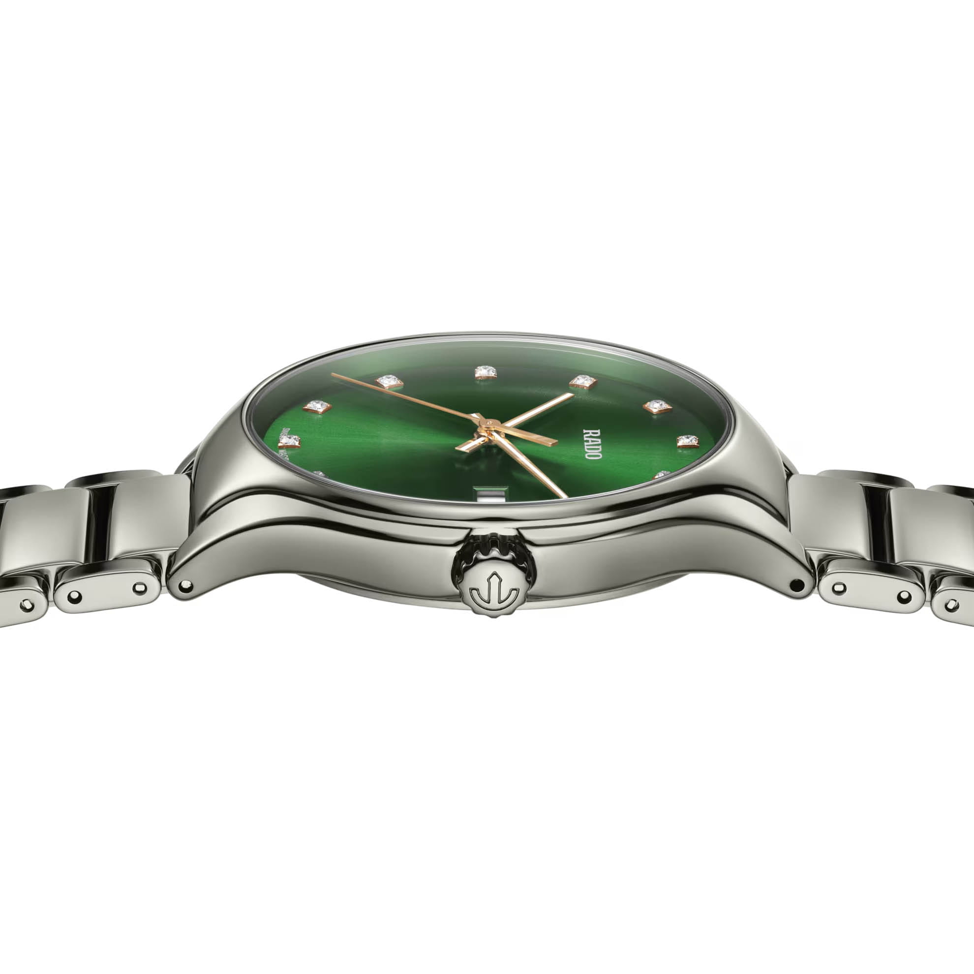 Мужские кварцевые часы Rado True — это изысканный аксессуар с современным дизайном и высокотехнологичными материалами. Корпус диаметром 40 мм выполнен из цельного блока высокотехнологичной плазменной керамикиВысокотехнологичная плазменная керамикаИнновационный материал, технология запатентована. Выплавление керамики осуществляется в печи при 20 000 °C, белоснежный материал под воздействием ультравысокой температуры приобретает уникальный блеск, присущий металлам., что обеспечивает лёгкость, прочность и устойчивость к царапинам. Циферблат зелёного цвета украшен 12 бриллиантами и защищён выпуклым сапфировым стекломСапфировое стеклоПрочный и надёжный материал из кристалла сапфира синтетического происхождения, характеризующийся особой твёрдостью и устойчивостью к царапинам и повреждениям.. Стрелки розового золота с белым покрытием и метки снабжены люминесцентным покрытиемЛюминесцентное покрытиеПозволяет считывать показания времени в темноте. Производители наносят на стрелки, часовые индексы, безель или поверхность циферблата светонакопительный состав, дающий холодное свечение. Super-Luminova®, обеспечивающим отличную читаемость в темноте. Механизм — кварцевый. Часы оснащены браслетом из высокотехнологичной плазменной керамикиВысокотехнологичная плазменная керамикаИнновационный материал, технология запатентована. Выплавление керамики осуществляется в печи при 20 000 °C, белоснежный материал под воздействием ультравысокой температуры приобретает уникальный блеск, присущий металлам. и титана с застёжкой «бабочка» с кнопкамиЗастёжка "бабочка"Такой вид застёжки дополняется предохранителями, помогающими избежать случайного раскрытия браслета. Обладают изящным исполнением. из титана. Водонепроницаемость 50 м позволяет использовать часы в повседневных условиях. Идеальный выбор для тех, кто ценит инновации, стиль и швейцарское качество.