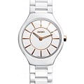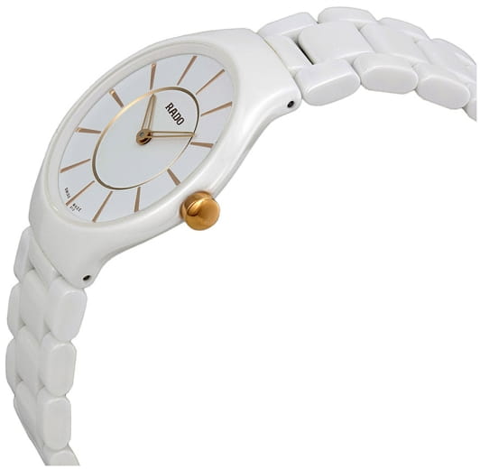Швейцарские женские Rado True Thinline R27958102, кварцевый механизм с высокой точностью. Сапфировое стеклоСапфировое стеклоПрочный и надёжный материал из кристалла сапфира синтетического происхождения, характеризующийся особой твёрдостью и устойчивостью к царапинам и повреждениям. устойчивое к появлению царапин, обладающее высокой прозрачностью. Корпус часов изготовлен из высокотехнологичной керамикиВысокотехнологичная керамикаИнновационный запатентованный Rado материал с гладкой или матовой поверхностью. Керамика за счёт кристаллической структуры обладает повышенной устойчивостью от возникновения царапин. Материал способен принимать температуру тела человека, обеспечивая невероятный комфорт при ношении.. Класс водозащиты: 30 метров, позволит защитить корпус от случайных брызг или капель дождя. Керамический браслет на застёжке-бабочке с кнопкамиЗастёжка "бабочка"Такой вид застёжки дополняется предохранителями, помогающими избежать случайного раскрытия браслета. Обладают изящным исполнением. .