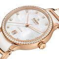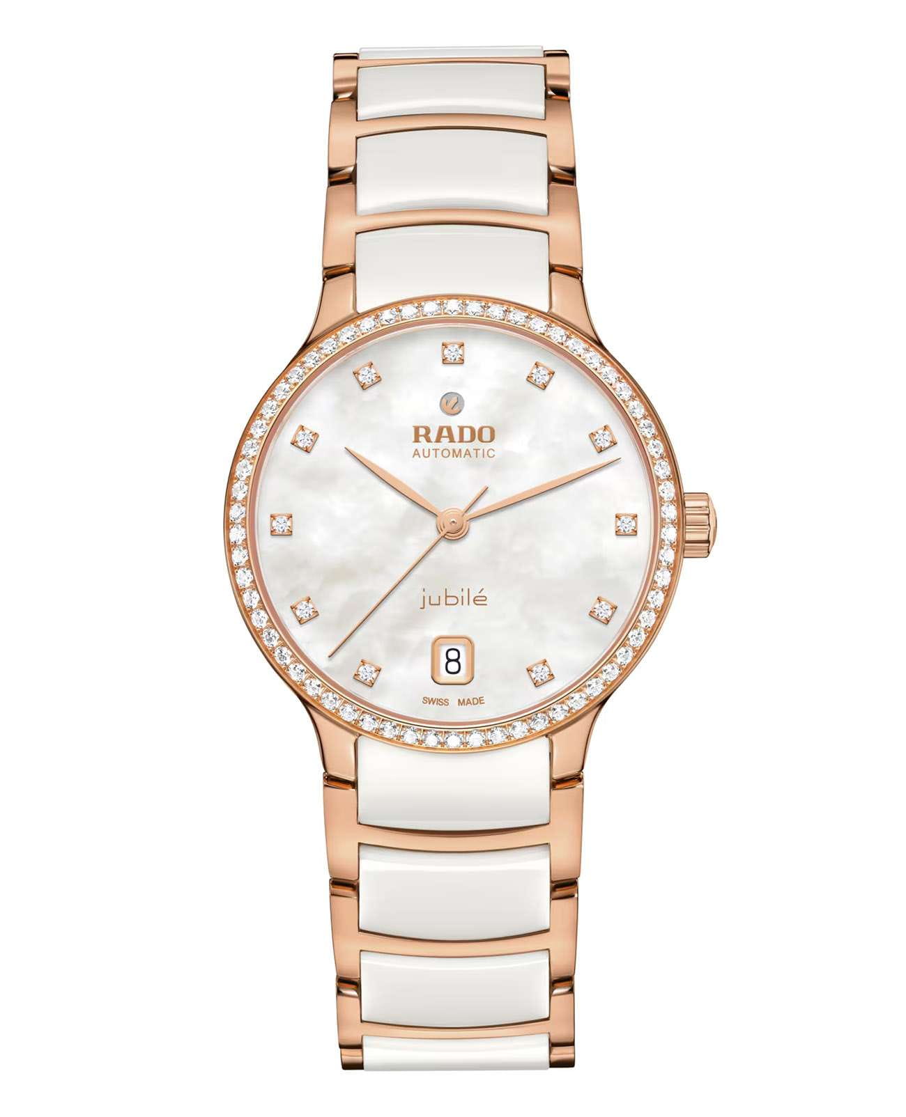 Женские механические часы с автоподзаводом Rado из коллекции Centrix — это гармоничное сочетание искусства, дизайна и швейцарского мастерства. Корпус диаметром 35 мм и толщиной 11,1 мм выполнен из нержавеющей стали с PVD-покрытиемPVDУльтратонкое покрытие наносится в технике вакуумного напыления, сочетает в себе нитрид титана особой прочности со слоем золота или оксида хрома. Несёт в себе декоративную или защитную функцию. розового золота. БезельБезельВнешний ободок, закрепляющий стекло. В спортивных часах так называется поворотное кольцо с делениями на циферблате, выполняет роль таймера – замеряет отрезки времени на шкале. Неподвижный безель – элемент декора. Однонаправленно вращающийся безель на дайверских часах позволяет фиксировать моменты погружения и выныривания на поверхность. из нержавеющей стали инкрустирован 60 бриллиантами полной огранки Top Wesselton VS-SI. Циферблат бежевого цвета из натурального перламутра украшен 11 бриллиантами и дополнен окошком даты в положении 6 часов. Циферблат защищён выпуклым сапфировым стекломСапфировое стеклоПрочный и надёжный материал из кристалла сапфира синтетического происхождения, характеризующийся особой твёрдостью и устойчивостью к царапинам и повреждениям. с антибликовым покрытиемАнтибликовое покрытиеСлой оксида металла в 0,13-0,3 микрон, благодаря которому стекло часов не бликует и не отражает свет. Антибликовое покрытие уменьшает отражение света в 10 раз, обеспечивая отличную читаемость показателей циферблата. с обеих сторон. Механизм — автоматический калибр R763 с антимагнитной пружиной Nivachron™Nivachron™Специально разработанный инновационный сплав Nivachron™ повышает устойчивость часов к воздействию магнитных полей., отрегулированный в пяти положениях, с запасом хода 80 часов. Прозрачная задняя крышка с сапфировым стеклом позволяет наблюдать за работой механизма. Часы оснащены браслетом из полированной стали с PVD-покрытиемPVDУльтратонкое покрытие наносится в технике вакуумного напыления, сочетает в себе нитрид титана особой прочности со слоем золота или оксида хрома. Несёт в себе декоративную или защитную функцию. розового золота и вставками из высокотехнологичной керамикиВысокотехнологичная керамикаИнновационный запатентованный Rado материал с гладкой или матовой поверхностью. Керамика за счёт кристаллической структуры обладает повышенной устойчивостью от возникновения царапин. Материал способен принимать температуру тела человека, обеспечивая невероятный комфорт при ношении., а также трёхсекционной застёжкой из нержавеющей стали. Водонепроницаемость 50 м позволяет использовать часы в повседневных условиях. Гарантия — 5 лет. Идеальный выбор для тех, кто ценит роскошь, точность и элегантность.