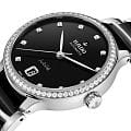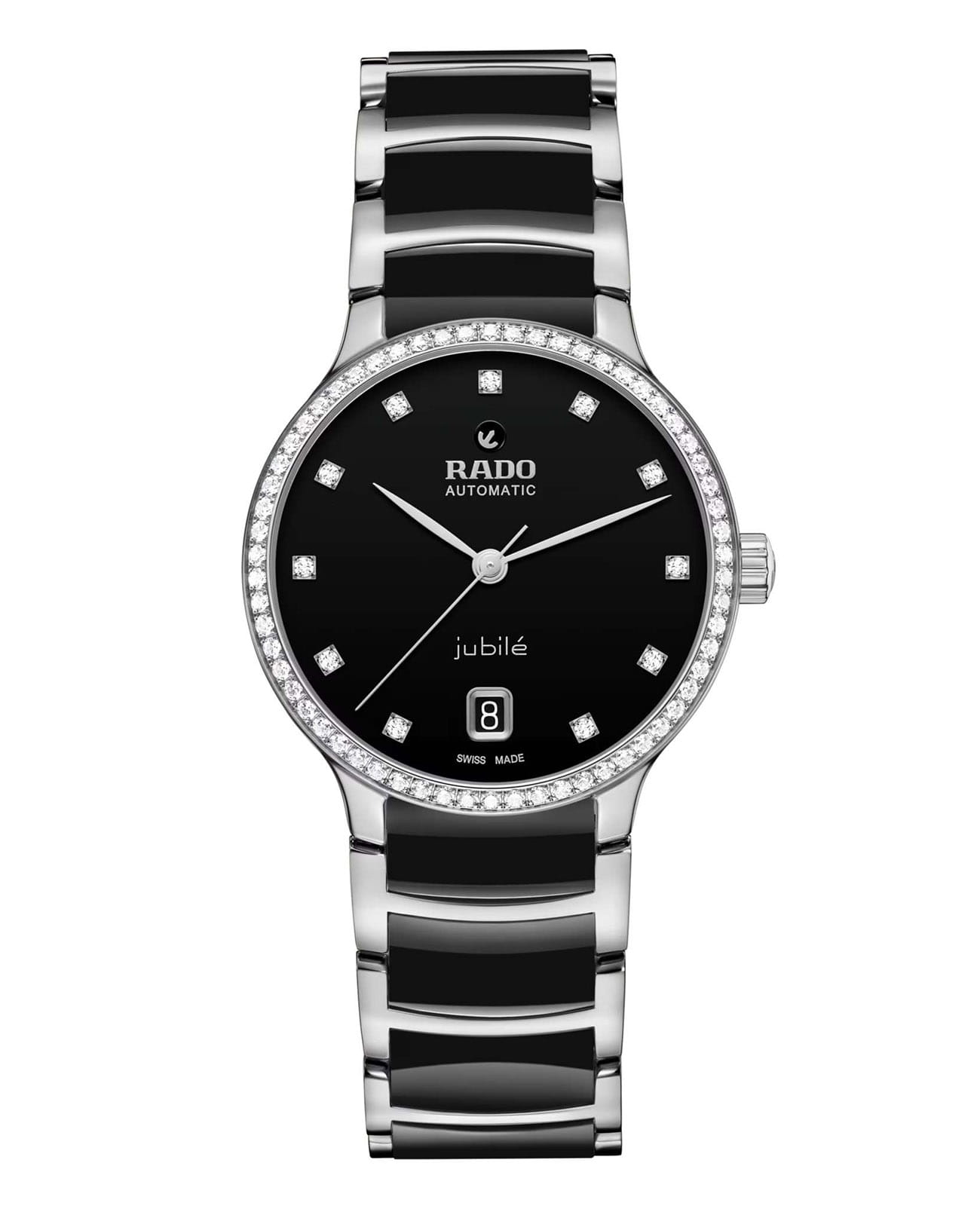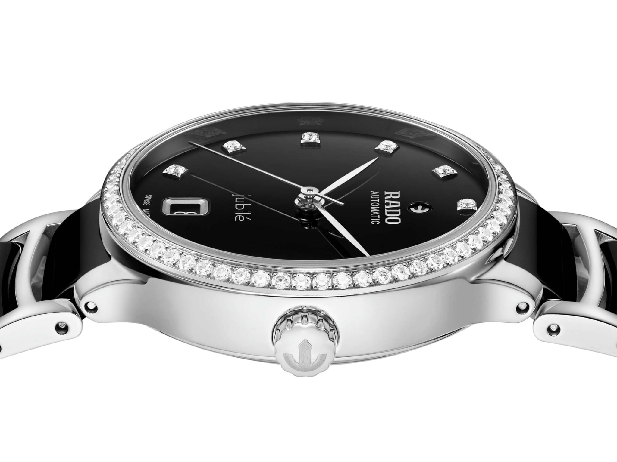 Женские механические часы с автоподзаводом Rado из коллекции Centrix — это гармоничное сочетание искусства, дизайна и швейцарского мастерства. Корпус диаметром 35 мм и толщиной 11,1 мм выполнен из нержавеющей стали 316L. БезельБезельВнешний ободок, закрепляющий стекло. В спортивных часах так называется поворотное кольцо с делениями на циферблате, выполняет роль таймера – замеряет отрезки времени на шкале. Неподвижный безель – элемент декора. Однонаправленно вращающийся безель на дайверских часах позволяет фиксировать моменты погружения и выныривания на поверхность. из нержавеющей стали инкрустирован 60 бриллиантами полной огранки Top Wesselton VS-SI. Циферблат чёрного цвета с лакированным покрытием украшен 11 бриллиантами и дополнен окошком даты в положении 6 часов. Циферблат защищён выпуклым сапфировым стекломСапфировое стеклоПрочный и надёжный материал из кристалла сапфира синтетического происхождения, характеризующийся особой твёрдостью и устойчивостью к царапинам и повреждениям. с антибликовым покрытиемАнтибликовое покрытиеСлой оксида металла в 0,13-0,3 микрон, благодаря которому стекло часов не бликует и не отражает свет. Антибликовое покрытие уменьшает отражение света в 10 раз, обеспечивая отличную читаемость показателей циферблата. с обеих сторон. Механизм — автоматический калибр R763 с антимагнитной пружиной Nivachron™Nivachron™Специально разработанный инновационный сплав Nivachron™ повышает устойчивость часов к воздействию магнитных полей., отрегулированный в пяти положениях, с запасом хода 80 часов. Прозрачная задняя крышка с сапфировым стеклом позволяет наблюдать за работой механизма. Часы оснащены браслетом из полированной нержавеющей стали и вставками из высокотехнологичной керамикиВысокотехнологичная керамикаИнновационный запатентованный Rado материал с гладкой или матовой поверхностью. Керамика за счёт кристаллической структуры обладает повышенной устойчивостью от возникновения царапин. Материал способен принимать температуру тела человека, обеспечивая невероятный комфорт при ношении. чёрного цвета, а также трёхсекционной застёжкой из нержавеющей стали. Водонепроницаемость 50 м позволяет использовать часы в повседневных условиях. Гарантия — 5 лет. Идеальный выбор для тех, кто ценит роскошь, точность и элегантность.