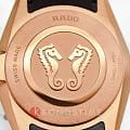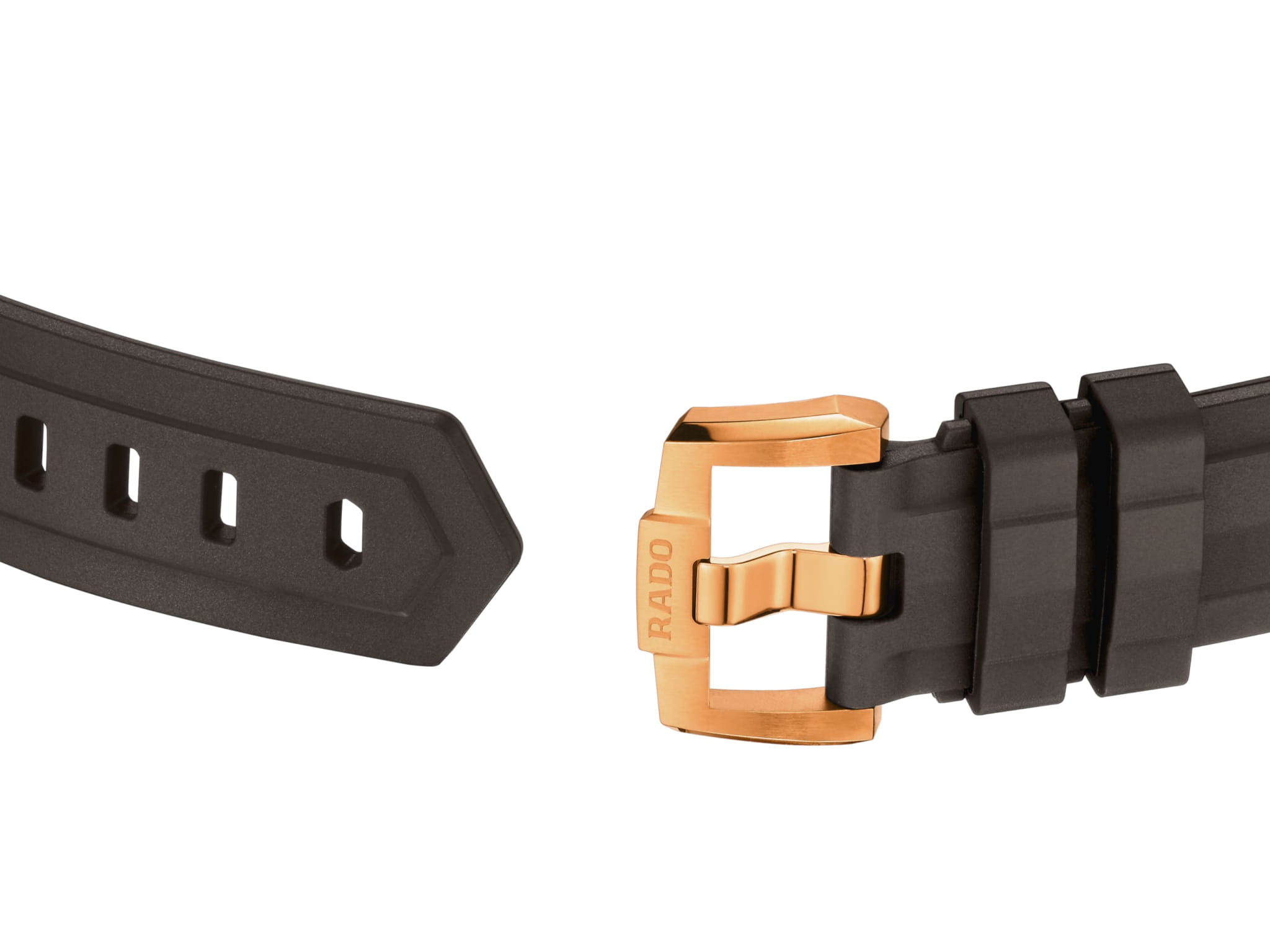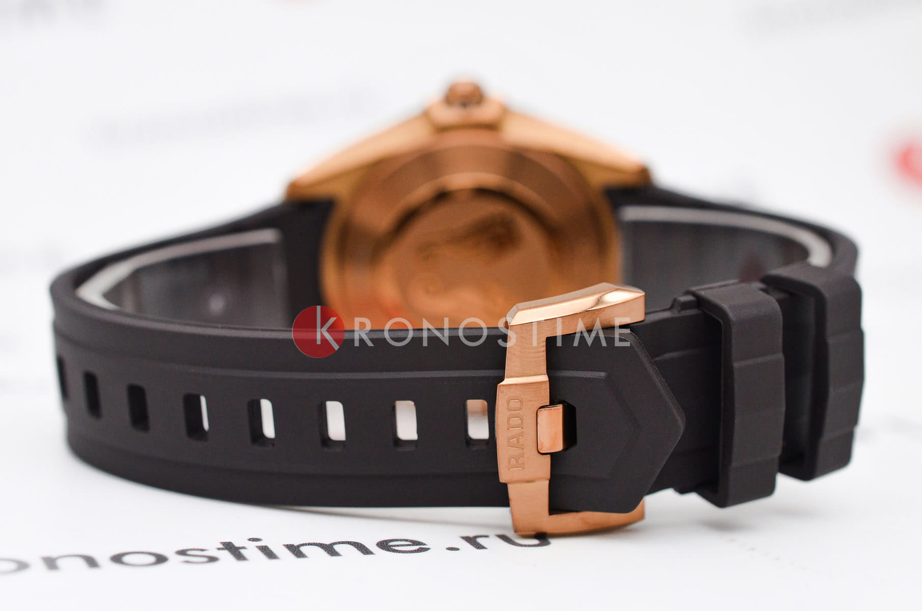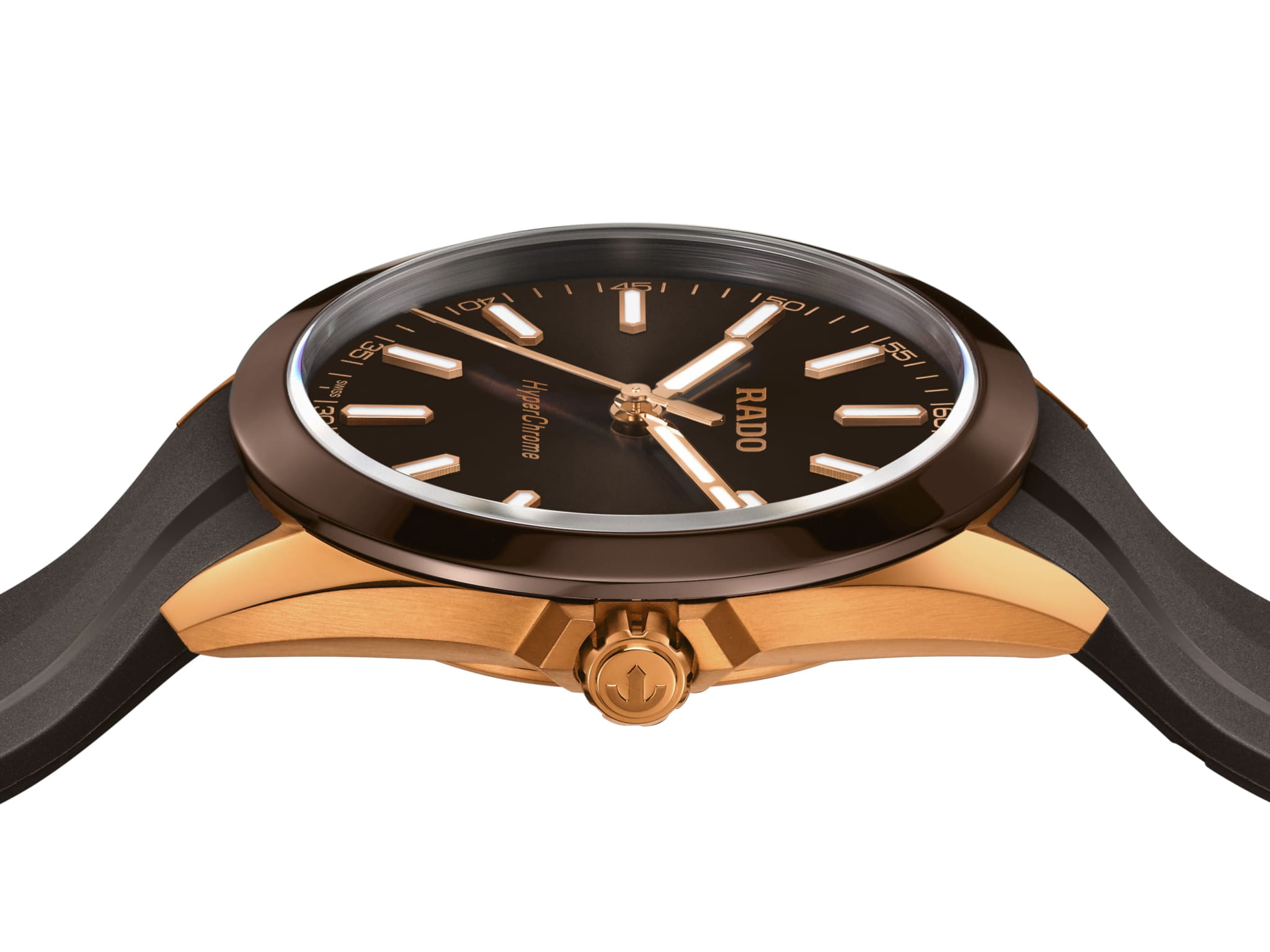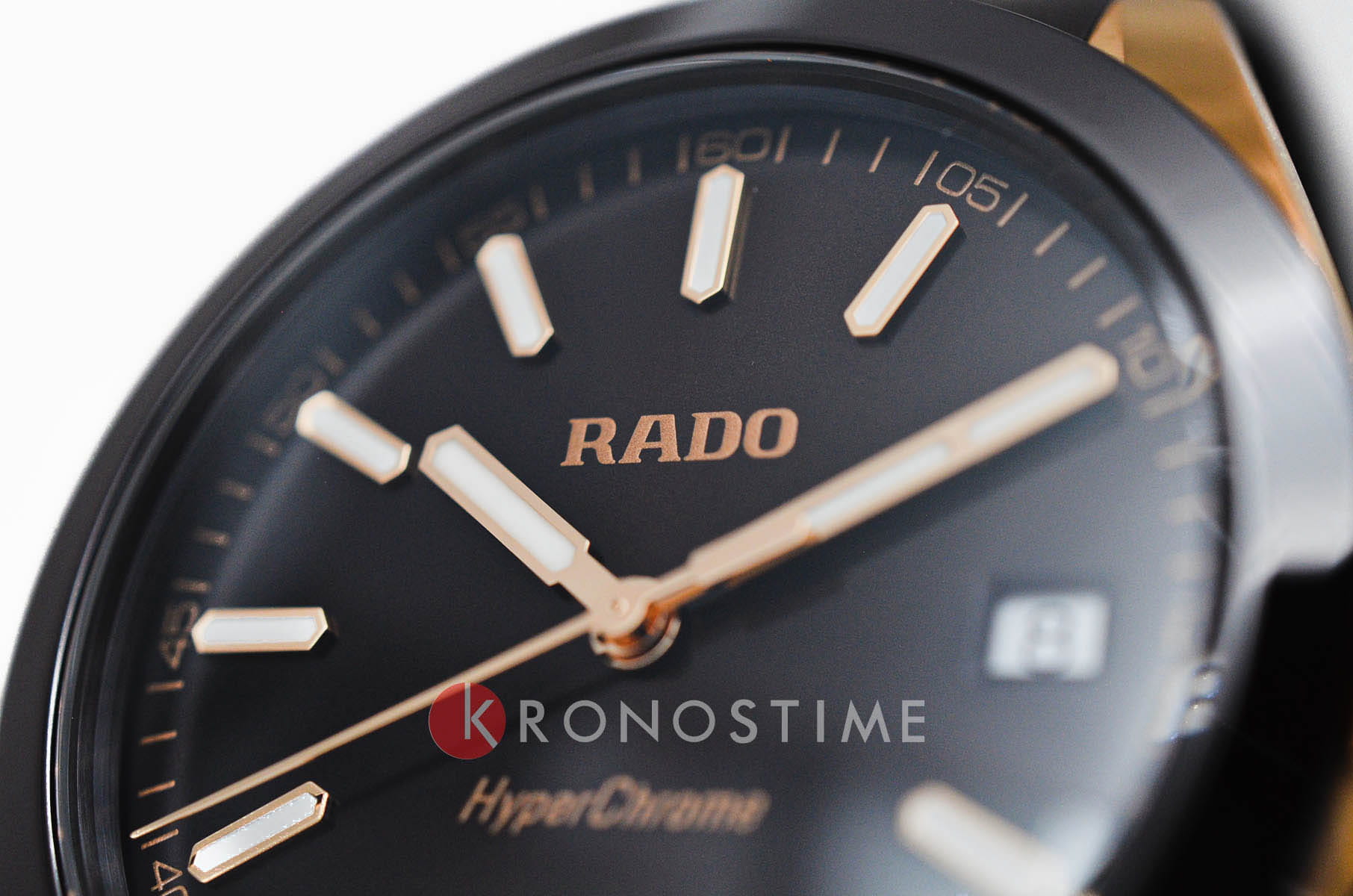 Мужские кварцевые часы Rado HyperChrome — это современное воплощение точности и мастерства материалов. Корпус диаметром 41,5 мм и толщиной 11,7 мм выполнен из нержавеющей стали с PVD-покрытиемPVDУльтратонкое покрытие наносится в технике вакуумного напыления, сочетает в себе нитрид титана особой прочности со слоем золота или оксида хрома. Несёт в себе декоративную или защитную функцию. розового золота, полированной и матовой. БезельБезельВнешний ободок, закрепляющий стекло. В спортивных часах так называется поворотное кольцо с делениями на циферблате, выполняет роль таймера – замеряет отрезки времени на шкале. Неподвижный безель – элемент декора. Однонаправленно вращающийся безель на дайверских часах позволяет фиксировать моменты погружения и выныривания на поверхность. изготовлен из высокотехнологичной керамикиВысокотехнологичная керамикаИнновационный запатентованный Rado материал с гладкой или матовой поверхностью. Керамика за счёт кристаллической структуры обладает повышенной устойчивостью от возникновения царапин. Материал способен принимать температуру тела человека, обеспечивая невероятный комфорт при ношении. коричневого цвета, придающей часам прочность и изысканность. Циферблат коричневого цвета с эффектом «солнечные лучи» оформлен накладными индексами и стрелками розового золота с люминесцентным покрытиемЛюминесцентное покрытиеПозволяет считывать показания времени в темноте. Производители наносят на стрелки, часовые индексы, безель или поверхность циферблата светонакопительный состав, дающий холодное свечение. Super-Luminova®. Особенность подсветки — зелёное свечение метки 12 часов и минутной стрелки, и синее — остальных индексов и часовой стрелки, что обеспечивает интуитивное считывание времени в темноте. Циферблат защищён выпуклым сапфировым стекломСапфировое стеклоПрочный и надёжный материал из кристалла сапфира синтетического происхождения, характеризующийся особой твёрдостью и устойчивостью к царапинам и повреждениям. с антибликовым покрытиемАнтибликовое покрытиеСлой оксида металла в 0,13-0,3 микрон, благодаря которому стекло часов не бликует и не отражает свет. Антибликовое покрытие уменьшает отражение света в 10 раз, обеспечивая отличную читаемость показателей циферблата. на внутренней стороне. Механизм — кварцевый. Окошко даты расположено в положении 3 часов. Часы оснащены каучуковым ремешком коричневого цвета с пряжкой из нержавеющей стали с PVD-покрытиемPVDУльтратонкое покрытие наносится в технике вакуумного напыления, сочетает в себе нитрид титана особой прочности со слоем золота или оксида хрома. Несёт в себе декоративную или защитную функцию. розового золота. Водонепроницаемость 150 м позволяет использовать часы для плавания и повседневного ношения. Идеальный выбор для тех, кто ценит инновации, точность и смелый дизайн.