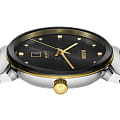БезельБезельВнешний ободок, закрепляющий стекло. В спортивных часах так называется поворотное кольцо с делениями на циферблате, выполняет роль таймера – замеряет отрезки времени на шкале. Неподвижный безель – элемент декора. Однонаправленно вращающийся безель на дайверских часах позволяет фиксировать моменты погружения и выныривания на поверхность. выполнен из стали с PVD-покрытиемPVDУльтратонкое покрытие наносится в технике вакуумного напыления, сочетает в себе нитрид титана особой прочности со слоем золота или оксида хрома. Несёт в себе декоративную или защитную функцию., что придаёт часам изысканный блеск и дополнительную защиту от износа. Окошко даты расположено в положении 6 часов, предоставляющее удобный доступ к актуальной дате. Циферблат инкрустирован бриллиантами, что добавляет часам нотку роскоши и изысканности.