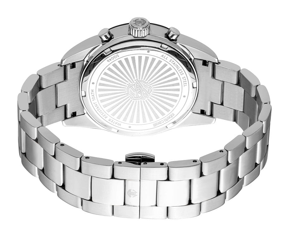 ROBERTO CAVALLI Uomo Chrono RC5G046M1065 — стильные итальянские часы с функцией хронографаХронографФункция позволяет измерять отрезки времени с особой точностью: часы, минуты, секунды. Верным признаком хронографа является наличие на циферблате 3 дополнительных окошек-счётчиков., которые сочетают в себе элегантность и современный функционал. Круглый корпус диаметром 42 мм выполнен из нержавеющей стали, толщина корпуса составляет 12 мм, что придает модели выразительный внешний вид и надежную защиту от внешних воздействий. Часы оснащены кварцевым механизмом, также обладают функцией отображения даты, что делает их удобными для ежедневного использования. Минеральное стеклоМинеральное стеклоМинеральное стекло представляет собой искусственно выращенный минерал кварца. Такое стекло отличается особой устойчивостью к повреждениям и царапинам. Уступает по некоторым качествам сапфировому стеклу. защищает часы от царапин. Водозащита 100 метров, позволит плавать, нырять и заниматься другими водными видами спорта. Неподвижный безельБезельВнешний ободок, закрепляющий стекло. В спортивных часах так называется поворотное кольцо с делениями на циферблате, выполняет роль таймера – замеряет отрезки времени на шкале. Неподвижный безель – элемент декора. Однонаправленно вращающийся безель на дайверских часах позволяет фиксировать моменты погружения и выныривания на поверхность. с PVD-покрытиемPVDУльтратонкое покрытие наносится в технике вакуумного напыления, сочетает в себе нитрид титана особой прочности со слоем золота или оксида хрома. Несёт в себе декоративную или защитную функцию.. Стальной браслет на застёжке-бабочке с кнопкамиЗастёжка "бабочка"Такой вид застёжки дополняется предохранителями, помогающими избежать случайного раскрытия браслета. Обладают изящным исполнением. обеспечивает комфортное ношение. Стрелки с люминесцентным покрытиемЛюминесцентное покрытиеПозволяет считывать показания времени в темноте. Производители наносят на стрелки, часовые индексы, безель или поверхность циферблата светонакопительный состав, дающий холодное свечение. обеспечивают отличную читаемость в любое время суток.