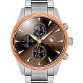 Мужские кварцевые часы Santa Barbara Polo & Racquet Club — это стильный и функциональный аксессуар для уверенного в себе мужчины. Корпус диаметром 43 мм и высотой 51,5 мм выполнен из нержавеющей стали, безель с IP-покрытиемIP-покрытиеМетод ионного напыления. Демонстрирует повышенную устойчивость к истиранию, окислению и химическим веществам. Под воздействием высокого давления и температуры около 1500°C молекулы металла надёжно соединяются с частицами корпуса часов. розового золота. Циферблат коричневого цвета оформлен по технологии Sunray («солнечные лучи»), дополнен накладными метками в виде штрихов и фирменным логотипом. Указатели дня недели и даты вынесены на отдельные субциферблаты, также присутствует индикация 24-часового формата времени. Стрелки с люминесцентным покрытиемЛюминесцентное покрытиеПозволяет считывать показания времени в темноте. Производители наносят на стрелки, часовые индексы, безель или поверхность циферблата светонакопительный состав, дающий холодное свечение., обеспечивающим хорошую читаемость в темноте. Циферблат защищён минеральным стекломМинеральное стеклоМинеральное стекло представляет собой искусственно выращенный минерал кварца. Такое стекло отличается особой устойчивостью к повреждениям и царапинам. Уступает по некоторым качествам сапфировому стеклу.. Механизм — кварцевый. Часы оснащены стальным браслетом с раскладной застёжкойРаскладная застёжкаТакой тип застёжки используется только на браслетах из металла. Она никогда не раскрывается полностью, происходит разделение на 2 и более частей. Раскладывающая застёжка снизит вероятность потери часов к минимуму.. Водонепроницаемость 50 м позволяет использовать часы в повседневных условиях. Идеальный выбор для тех, кто ценит стиль, точность и надёжность.