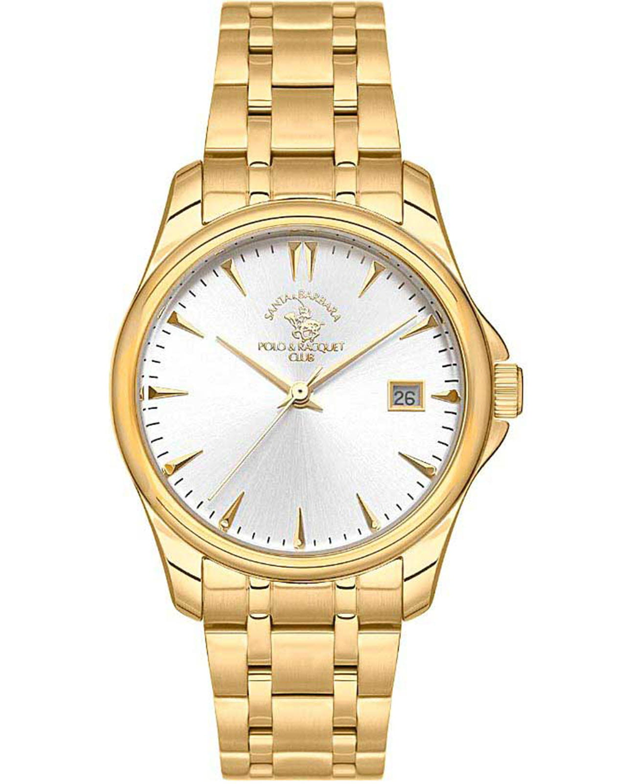 Женские кварцевые часы Santa Barbara Polo & Racquet Club — стильный аксессуар. Корпус диаметром 34 мм и высотой 41,5 мм выполнен из латуни с IP-покрытиемIP-покрытиеМетод ионного напыления. Демонстрирует повышенную устойчивость к истиранию, окислению и химическим веществам. Под воздействием высокого давления и температуры около 1500°C молекулы металла надёжно соединяются с частицами корпуса часов.. Циферблат серебристого цвета оформлен по технологии Sunray («солнечные лучи»), дополнен накладными метками в виде штрихов и фирменным логотипом. Окошко даты расположено в положении 3 часов. Циферблат защищён минеральным стекломМинеральное стеклоМинеральное стекло представляет собой искусственно выращенный минерал кварца. Такое стекло отличается особой устойчивостью к повреждениям и царапинам. Уступает по некоторым качествам сапфировому стеклу.. Часы оснащены стальным браслетом с IP-покрытиемIP-покрытиеМетод ионного напыления. Демонстрирует повышенную устойчивость к истиранию, окислению и химическим веществам. Под воздействием высокого давления и температуры около 1500°C молекулы металла надёжно соединяются с частицами корпуса часов. и раскладной застёжкойРаскладная застёжкаТакой тип застёжки используется только на браслетах из металла. Она никогда не раскрывается полностью, происходит разделение на 2 и более частей. Раскладывающая застёжка снизит вероятность потери часов к минимуму.. Идеальный выбор для тех, кто ценит стиль и качество по доступной цене.