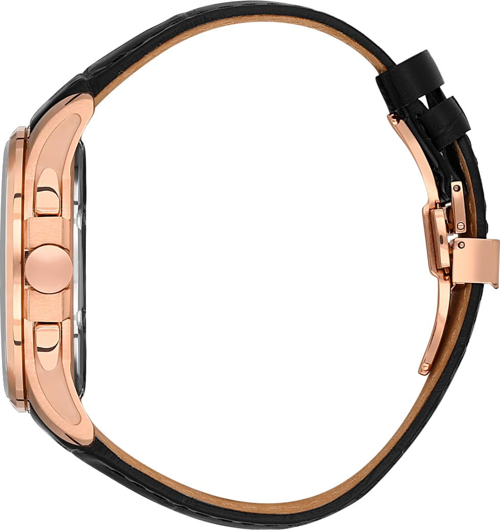 Мужские кварцевые часы Santa Barbara Polo & Racquet Club — это идеальный выбор для тех, кто ценит практичность и стиль. Корпус диаметром 43 мм выполнен из нержавеющей стали 316L с IP-покрытиемIP-покрытиеМетод ионного напыления. Демонстрирует повышенную устойчивость к истиранию, окислению и химическим веществам. Под воздействием высокого давления и температуры около 1500°C молекулы металла надёжно соединяются с частицами корпуса часов. розового золота и полированной отделкой. Циферблат чёрного цвета украшен узором и фирменным логотипом, дополнен накладными метками в виде штрихов и арабской цифрой 12. Указатели дня недели и даты вынесены на отдельные субциферблаты, также присутствует индикация 24-часового формата времени. Стрелки и метки с люминесцентным покрытиемЛюминесцентное покрытиеПозволяет считывать показания времени в темноте. Производители наносят на стрелки, часовые индексы, безель или поверхность циферблата светонакопительный состав, дающий холодное свечение., обеспечивающим хорошую читаемость в темноте. Циферблат защищён минеральным стекломМинеральное стеклоМинеральное стекло представляет собой искусственно выращенный минерал кварца. Такое стекло отличается особой устойчивостью к повреждениям и царапинам. Уступает по некоторым качествам сапфировому стеклу.. Часы оснащены кожаным ремешком на застёжке «бабочка» с кнопкамиЗастёжка "бабочка"Такой вид застёжки дополняется предохранителями, помогающими избежать случайного раскрытия браслета. Обладают изящным исполнением. . Водонепроницаемость 50 м позволяет использовать часы в повседневных условиях. Идеальный выбор для тех, кто ценит классический дизайн, точность и надёжность..
