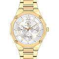 Женские кварцевые Santa Barbara Polo & Racquet Club Luxury SB.1.10596-3 — воплощение элегантности и технического совершенства. Изысканный корпус из нержавеющей стали с IP-покрытиемIP-покрытиеМетод ионного напыления. Демонстрирует повышенную устойчивость к истиранию, окислению и химическим веществам. Под воздействием высокого давления и температуры около 1500°C молекулы металла надёжно соединяются с частицами корпуса часов. золотистого цвета, диаметром 36 мм, что делает их устойчивыми к внешним воздействиям и придает благородный вид. Стрелки и метки с люминесцентным покрытиемЛюминесцентное покрытиеПозволяет считывать показания времени в темноте. Производители наносят на стрелки, часовые индексы, безель или поверхность циферблата светонакопительный состав, дающий холодное свечение., обеспечивающим хорошую читаемость в темноте. Изящный циферблат защищён минеральным стекломМинеральное стеклоМинеральное стекло представляет собой искусственно выращенный минерал кварца. Такое стекло отличается особой устойчивостью к повреждениям и царапинам. Уступает по некоторым качествам сапфировому стеклу., устойчивое к царапинам и механическим повреждениям. Браслет из стали с IP-покрытиемIP-покрытиеМетод ионного напыления. Демонстрирует повышенную устойчивость к истиранию, окислению и химическим веществам. Под воздействием высокого давления и температуры около 1500°C молекулы металла надёжно соединяются с частицами корпуса часов. на застёжке «бабочка» с кнопкамиЗастёжка "бабочка"Такой вид застёжки дополняется предохранителями, помогающими избежать случайного раскрытия браслета. Обладают изящным исполнением. обеспечивает комфортное и безопасное ношение. 12-ти и 24-х часовой формат времени. Водонепроницаемость 50 метров позволит защитить корпус от случайных брызг или капель дождя. Идеальный выбор для тех, кто ценит элегантный дизайн и качество.