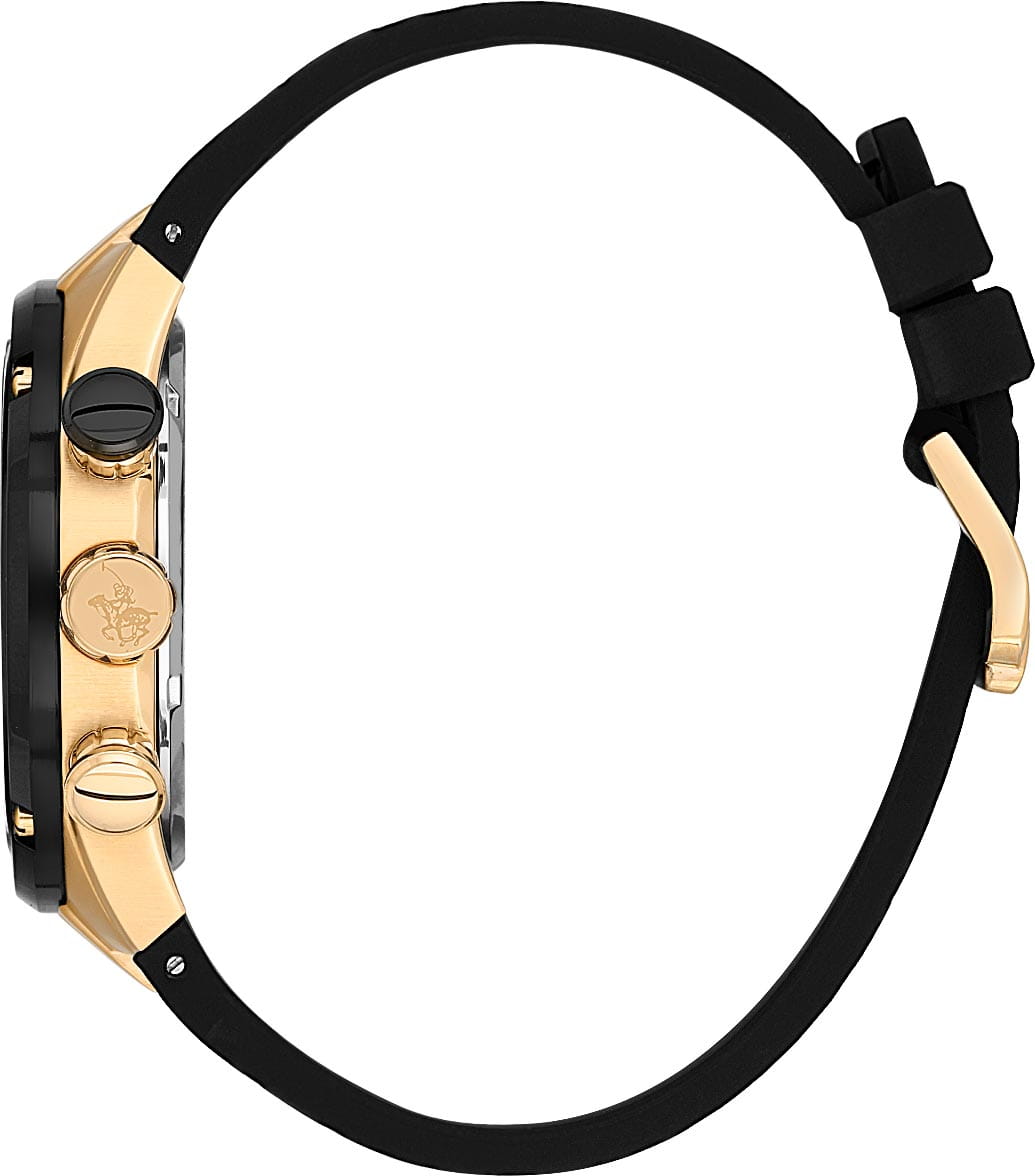 Мужские кварцевые часы-хронографХронографФункция позволяет измерять отрезки времени с особой точностью: часы, минуты, секунды. Верным признаком хронографа является наличие на циферблате 3 дополнительных окошек-счётчиков. с секундомеромСекундомерСекундоме́р — прибор, способный измерять интервалы времени с точностью до долей секунды. Santa Barbara Polo & Racquet Club SB.3.10001-5 — воплощение элегантности и технического совершенства. Корпус из нержавеющей стали с IP-покрытиемIP-покрытиеМетод ионного напыления. Демонстрирует повышенную устойчивость к истиранию, окислению и химическим веществам. Под воздействием высокого давления и температуры около 1500°C молекулы металла надёжно соединяются с частицами корпуса часов. золотистого цвета, диаметром 45 мм, что делает их устойчивыми к внешним воздействиям и придает благородный вид. Стрелки и метки с люминесцентным покрытиемЛюминесцентное покрытиеПозволяет считывать показания времени в темноте. Производители наносят на стрелки, часовые индексы, безель или поверхность циферблата светонакопительный состав, дающий холодное свечение., обеспечивающим хорошую читаемость в темноте. Неподвижный безельБезельВнешний ободок, закрепляющий стекло. В спортивных часах так называется поворотное кольцо с делениями на циферблате, выполняет роль таймера – замеряет отрезки времени на шкале. Неподвижный безель – элемент декора. Однонаправленно вращающийся безель на дайверских часах позволяет фиксировать моменты погружения и выныривания на поверхность. с IP-покрытиемIP-покрытиеМетод ионного напыления. Демонстрирует повышенную устойчивость к истиранию, окислению и химическим веществам. Под воздействием высокого давления и температуры около 1500°C молекулы металла надёжно соединяются с частицами корпуса часов. черного цвета. Циферблат защищён минеральным стекломМинеральное стеклоМинеральное стекло представляет собой искусственно выращенный минерал кварца. Такое стекло отличается особой устойчивостью к повреждениям и царапинам. Уступает по некоторым качествам сапфировому стеклу. устойчивое к царапинам и механическим повреждениям. Окошко даты находится в положении 4 часа, тахиметрТахиметрРазмеченная шкала, располагается на ободке или безеле часов. Тахиметр позволяет рассчитать скорость на определённом участке пути, расстояние измеряется в километрах или милях. по внешнему краю. Кожаный ремешок на стандартной застёжке обеспечивает комфортное и безопасное ношение. Водонепроницаемость 100 метров позволит плавать, нырять и заниматься другими водными видами спорта. Идеальный выбор для тех, кто ценит элегантный дизайн и качество.