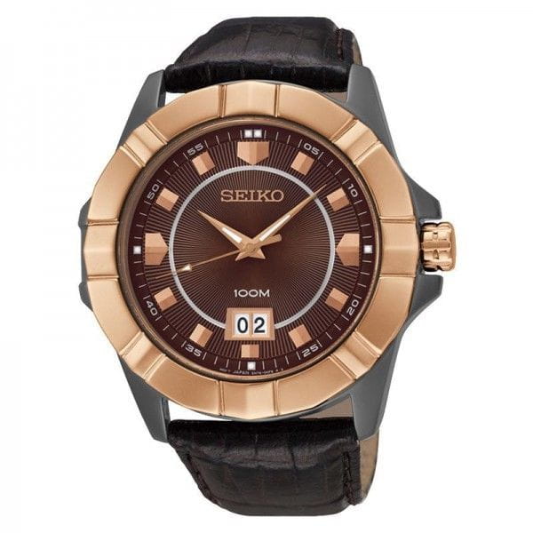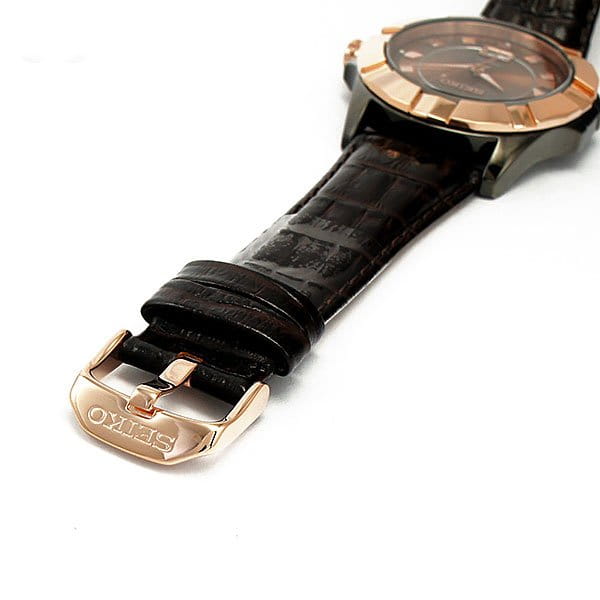 Seiko 6N76. Круглой формы корпус часов  выполнен из высокопрочной стали с PVD покрытием золотого цвета. Бронзовый фон циферблата и контрастные  элементы дизайна. Часы снабжены минеральны стеклом, устойчивым к царапинам. Водонепроницаемость 10 ATM. Часы прочно удерживаются на руке ремешком из натуральной кожи.