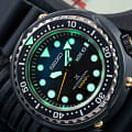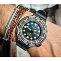 Уникальный безельБезельВнешний ободок, закрепляющий стекло. В спортивных часах так называется поворотное кольцо с делениями на циферблате, выполняет роль таймера – замеряет отрезки времени на шкале. Неподвижный безель – элемент декора. Однонаправленно вращающийся безель на дайверских часах позволяет фиксировать моменты погружения и выныривания на поверхность. с PVD-покрытиемPVDУльтратонкое покрытие наносится в технике вакуумного напыления, сочетает в себе нитрид титана особой прочности со слоем золота или оксида хрома. Несёт в себе декоративную или защитную функцию. не только подчеркивает стиль модели, но и добавляет дополнительную защиту, необходимую в сложных условиях. Класс водозащиты в 1000 метров делает эти часы идеальными для плавания, ныряния и занятий другими водными видами спорта, подчеркивая их универсальность.