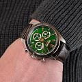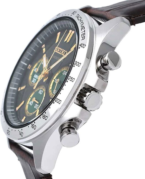 Мужские кварцевые часы-хронограф Seiko — это надёжный и функциональный аксессуар. Корпус диаметром 42 мм выполнен из нержавеющей стали 316L. Циферблат оформлен штрихами и стрелками. Присутствуют три субциферблата хронографа. Окошко даты расположено в положении между 4 и 5 часов. На циферблате присутствует шкала тахиметраТахиметрРазмеченная шкала, располагается на ободке или безеле часов. Тахиметр позволяет рассчитать скорость на определённом участке пути, расстояние измеряется в километрах или милях.. Стрелки и метки с люминесцентным покрытиемЛюминесцентное покрытиеПозволяет считывать показания времени в темноте. Производители наносят на стрелки, часовые индексы, безель или поверхность циферблата светонакопительный состав, дающий холодное свечение., обеспечивающим хорошую читаемость в темноте. Циферблат защищён прочным закалённым минеральным стеклом Hardlex. Механизм — японское кварцевое движение калибра 8T67 с функциями хронографаХронографФункция позволяет измерять отрезки времени с особой точностью: часы, минуты, секунды. Верным признаком хронографа является наличие на циферблате 3 дополнительных окошек-счётчиков. и секундомераСекундомерСекундоме́р — прибор, способный измерять интервалы времени с точностью до долей секунды.. Часы оснащены коричневым кожаным ремешком на классической пряжке. Водонепроницаемость 100 м позволяет использовать часы для плавания и повседневного ношения. Идеальный выбор для тех, кто ценит японское качество и универсальный дизайн.
