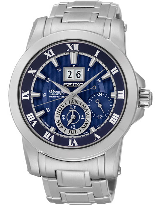 Часы оснащены автокварцевым механизмом Seiko Kinetic калибра 7D56, который преобразует энергию движения в электрическую, обеспечивая точный ход и запас хода до 4 лет в режиме ожидания. Функция вечного календаряВечный календарьКлассическое часовое усложнение, представляющее собой календарь, рассчитанный на несколько лет вперёд (стандартно – до 2099 года). Определяет текущую дату, день недели, месяц. автоматически корректирует дату до 2100 года, включая високосные годы. Циферблат защищён сапфировым стекломСапфировое стеклоПрочный и надёжный материал из кристалла сапфира синтетического происхождения, характеризующийся особой твёрдостью и устойчивостью к царапинам и повреждениям. с антибликовым покрытиемАнтибликовое покрытиеСлой оксида металла в 0,13-0,3 микрон, благодаря которому стекло часов не бликует и не отражает свет. Антибликовое покрытие уменьшает отражение света в 10 раз, обеспечивая отличную читаемость показателей циферблата., устойчивым к царапинам. Установлена раскладная застёжкаРаскладная застёжкаТакой тип застёжки используется только на браслетах из металла. Она никогда не раскрывается полностью, происходит разделение на 2 и более частей. Раскладывающая застёжка снизит вероятность потери часов к минимуму. с тройным сгибом и кнопкой освобождения. Модель обладает водонепроницаемостью до 100 метров, что делает её подходящей для плавания и сноркелинга.