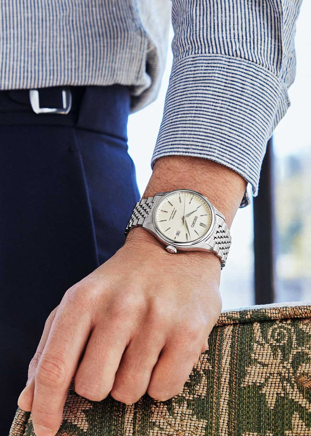 Мужские механические часы Seiko Presage Classic SPB463 — это отражение японского мастерства и внимания к деталям. Серия вдохновлена цветами, текстурами и материалами традиционных японских ремёсел, что нашло своё отражение в изысканном дизайне и высокой функциональности модели. Часы оснащены калибром 6R55 — надёжным механизмом с автоподзаводом и возможностью ручной подзаводки. Механизм работает на частоте 21 600 полуколебаний в час, имеет 24 драгоценных камня и обеспечивает запас хода до 72 часов. Также реализована функция стоп-секунды для точной установки времени и защита от магнитных полей до 4800 А/м. Циферблат бежевого цвета выполнен в стиле «широ-иро» — в оттенке неотбелённого шелка. Его поверхность украшена тонкой текстурой, напоминающей благородный блеск натуральной ткани. Центральный узор взаимодействует со светом, создавая ощущение глубины и элегантности. Метки выполнены в виде аккуратных штрихов, а информация о дате вынесена в окошко в положении 3 часов. Защиту циферблата обеспечивает сапфировое стеклоСапфировое стеклоПрочный и надёжный материал из кристалла сапфира синтетического происхождения, характеризующийся особой твёрдостью и устойчивостью к царапинам и повреждениям. выпуклой формы с антибликовым покрытием с обеих сторон. Корпус диаметром 40,2 мм изготовлен из нержавеющей стали и дополнен прозрачной завинчивающейся задней крышкой, через которую можно рассмотреть работу механизма. Браслет выполнен из стали и оснащён раскладной застёжкойРаскладная застёжкаТакой тип застёжки используется только на браслетах из металла. Она никогда не раскрывается полностью, происходит разделение на 2 и более частей. Раскладывающая застёжка снизит вероятность потери часов к минимуму., обеспечивающей комфорт и уверенную фиксацию на запястье. Часы водонепроницаемы до 100 метров , что позволяет использовать их при плавании или занятиях водными видами спорта. Эти часы станут универсальным аксессуаром для тех, кто ценит сочетание культурного наследия, технологий и эстетики — идеальный выбор для повседневной носки и торжественных случаев.