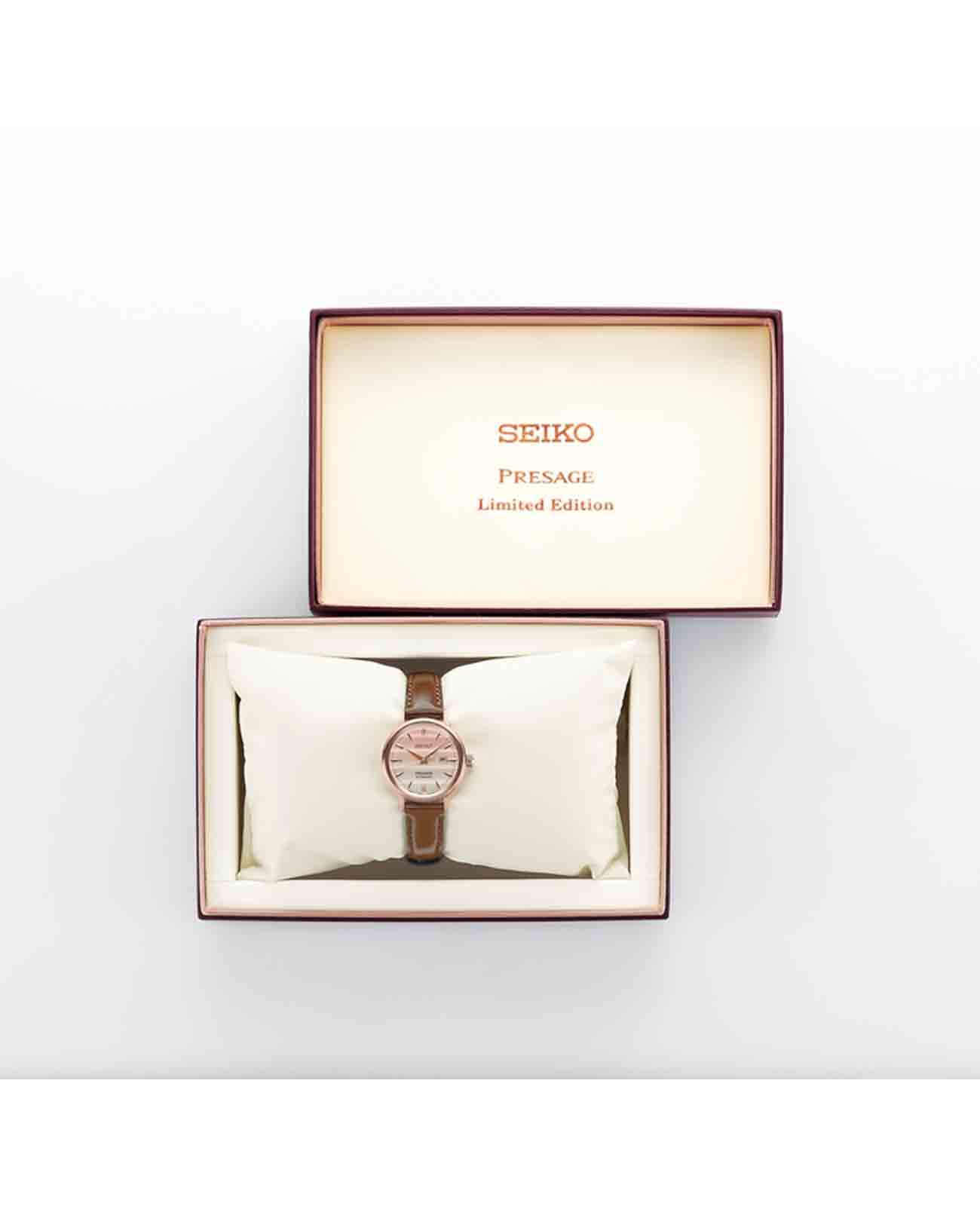 Женские японские механические часы Seiko Presage SRE014J1 — это настоящее произведение искусства, сочетающее в себе традиционный японский стиль и современную элегантность. Циферблат этих часов защищен минеральным стекломМинеральное стеклоМинеральное стекло представляет собой искусственно выращенный минерал кварца. Такое стекло отличается особой устойчивостью к повреждениям и царапинам. Уступает по некоторым качествам сапфировому стеклу., которое обеспечивает достаточную защиту от мелких царапин и сохраняет свою прозрачность на протяжении долгого времени. Корпус часов изготовлен из высококачественной нержавеющей стали с PVD-покрытиемPVDУльтратонкое покрытие наносится в технике вакуумного напыления, сочетает в себе нитрид титана особой прочности со слоем золота или оксида хрома. Несёт в себе декоративную или защитную функцию., что придает им уникальный оттенок и дополнительную защиту от внешних воздействий. Класс водозащиты 50 метров защищает часы от случайных брызг и капель дождя, делая их подходящими для повседневного использования. Эта модель выпущена ограниченной серией в количестве 5000 экземпляров, что подчеркивает ее эксклюзивность и коллекционную ценность. Дизайн часов вдохновлен японской культурой коктейлей и атмосферой знаменитого бара Star, где работает известный бармен Хисаши Киши, специализирующийся на создании уникальных напитков, сочетающих японские и международные вкусы. Цветовая гамма часов навеяна коктейлем Pinky Twilight, создавая ощущение легкого вечернего шика. Секундная стрелка выполнена в форме палочки для перемешивания коктейлей, что добавляет часам особого шарма и оригинальности. Внутри часов скрывается механизм с 21 камнем, работающий с частотой 21 600 полуколебаний в час, что обеспечивает высокую точность хода. Запас хода составляет 40 часов, а возможность ручного завода позволяет контролировать работу механизма. Окошко даты в положении 3 часа упрощает отслеживание календарных дней. Кожаный ремешок на раскладной застёжкеРаскладная застёжкаТакой тип застёжки используется только на браслетах из металла. Она никогда не раскрывается полностью, происходит разделение на 2 и более частей. Раскладывающая застёжка снизит вероятность потери часов к минимуму. завершает образ, придавая часам дополнительный комфорт и элегантность.