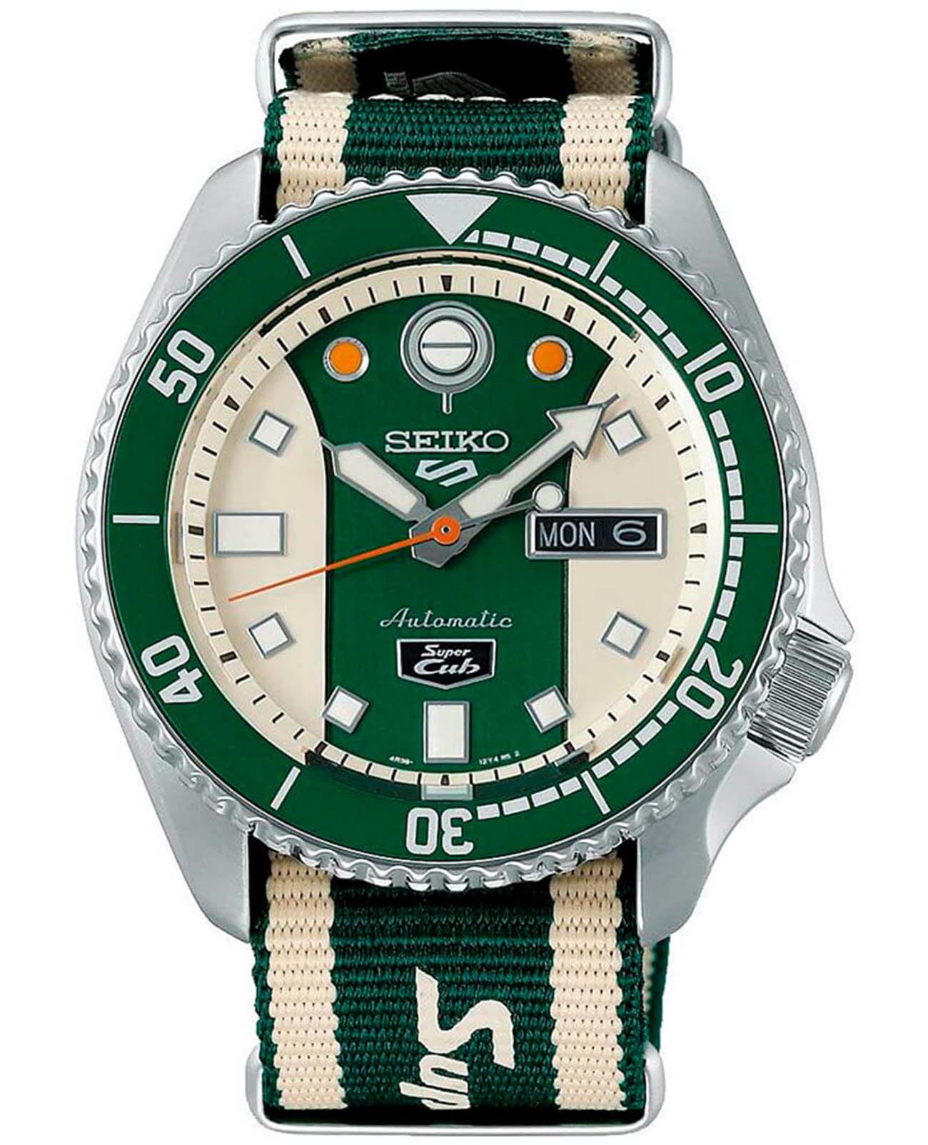 Мужские механические часы с автоподзаводом Seiko SRPJ49K1 — коллаборация с Honda в честь мотоцикла Super Cub 110. Корпус из нержавеющей стали, диаметром 42,5 мм. Циферблат — зелёно-белый, с окошками дня недели и даты в положении 3 часов. Стекло — минеральноеМинеральное стеклоМинеральное стекло представляет собой искусственно выращенный минерал кварца. Такое стекло отличается особой устойчивостью к повреждениям и царапинам. Уступает по некоторым качествам сапфировому стеклу. Hardlex. БезельБезельВнешний ободок, закрепляющий стекло. В спортивных часах так называется поворотное кольцо с делениями на циферблате, выполняет роль таймера – замеряет отрезки времени на шкале. Неподвижный безель – элемент декора. Однонаправленно вращающийся безель на дайверских часах позволяет фиксировать моменты погружения и выныривания на поверхность. однонаправленно вращающийся с PVD-покрытиемPVDУльтратонкое покрытие наносится в технике вакуумного напыления, сочетает в себе нитрид титана особой прочности со слоем золота или оксида хрома. Несёт в себе декоративную или защитную функцию.. Стрелки и метки с люминесцентным покрытиемЛюминесцентное покрытиеПозволяет считывать показания времени в темноте. Производители наносят на стрелки, часовые индексы, безель или поверхность циферблата светонакопительный состав, дающий холодное свечение. LumiBrite. Ремешок — двухцветный нейлоновый на стандартной застёжке. Водонепроницаемость 100 м. Механизм — японский калибр 4R36 с ручным заводом и запасом хода около 41 часа. Идеальный выбор для тех, кто ценит японское качество и нестандартный дизайн.
