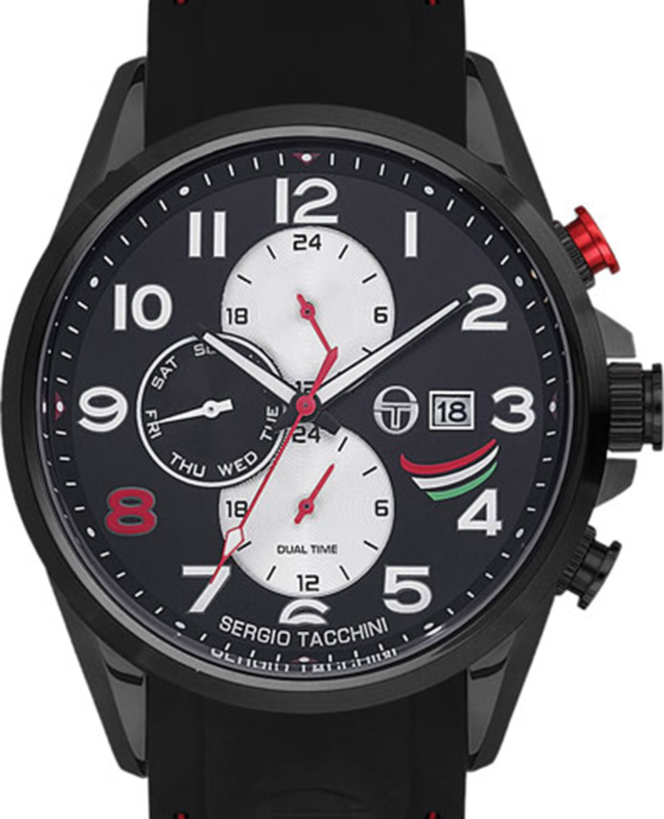 Мужские кварцевые часы Sergio Tacchini из коллекции Archivio — это надёжный спортивный аксессуар с функциональным дизайном. Корпус диаметром 46,5 мм выполнен из нержавеющей стали 316L с PVD-покрытиемPVDУльтратонкое покрытие наносится в технике вакуумного напыления, сочетает в себе нитрид титана особой прочности со слоем золота или оксида хрома. Несёт в себе декоративную или защитную функцию.. Циферблат чёрного цвета оформлен индексами и стрелками. Указатели дня недели и даты вынесены на отдельные субциферблаты, также присутствует индикация 24-часового формата времени и второй часовой пояс. Стрелки с люминесцентным покрытиемЛюминесцентное покрытиеПозволяет считывать показания времени в темноте. Производители наносят на стрелки, часовые индексы, безель или поверхность циферблата светонакопительный состав, дающий холодное свечение., обеспечивающим хорошую читаемость в темноте. Циферблат защищён минеральным стекломМинеральное стеклоМинеральное стекло представляет собой искусственно выращенный минерал кварца. Такое стекло отличается особой устойчивостью к повреждениям и царапинам. Уступает по некоторым качествам сапфировому стеклу. с антибликовым покрытиемАнтибликовое покрытиеСлой оксида металла в 0,13-0,3 микрон, благодаря которому стекло часов не бликует и не отражает свет. Антибликовое покрытие уменьшает отражение света в 10 раз, обеспечивая отличную читаемость показателей циферблата.. Часы оснащены силиконовым ремешком чёрного цвета с стандартной застёжкой. Водонепроницаемость 50 м позволяет использовать часы в повседневных условиях. Идеальный выбор для тех, кто ценит стиль, функциональность и комфорт.