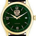 Российские механические наручные часы Слава Сенат 1499286/300-8215, которые станут идеальным аксессуаром для повседневного ношения. Эти часы сочетают в себе элегантность и практичность, предлагая безупречный стиль и надежность. Оснащенные механизмом Miyota 8215 с автоподзаводом, они обеспечивают точность и долговечность. Стальной корпус с IP-покрытиемIP-покрытиеМетод ионного напыления. Демонстрирует повышенную устойчивость к истиранию, окислению и химическим веществам. Под воздействием высокого давления и температуры около 1500°C молекулы металла надёжно соединяются с частицами корпуса часов. и сапфировым стекломСапфировое стеклоПрочный и надёжный материал из кристалла сапфира синтетического происхождения, характеризующийся особой твёрдостью и устойчивостью к царапинам и повреждениям. защищает зленый циферблат с арабскими цифрами и метками в виде штрихов. На циферблате изображены герб Российской Федерации. Часы также имеют календарь с окошком даты на 3 часах и водозащиту до 50WR, что делает их надежными в различных условиях. Текстурированный кожаный черный ремешок с классической застежкой завершает этот изысканный образ.