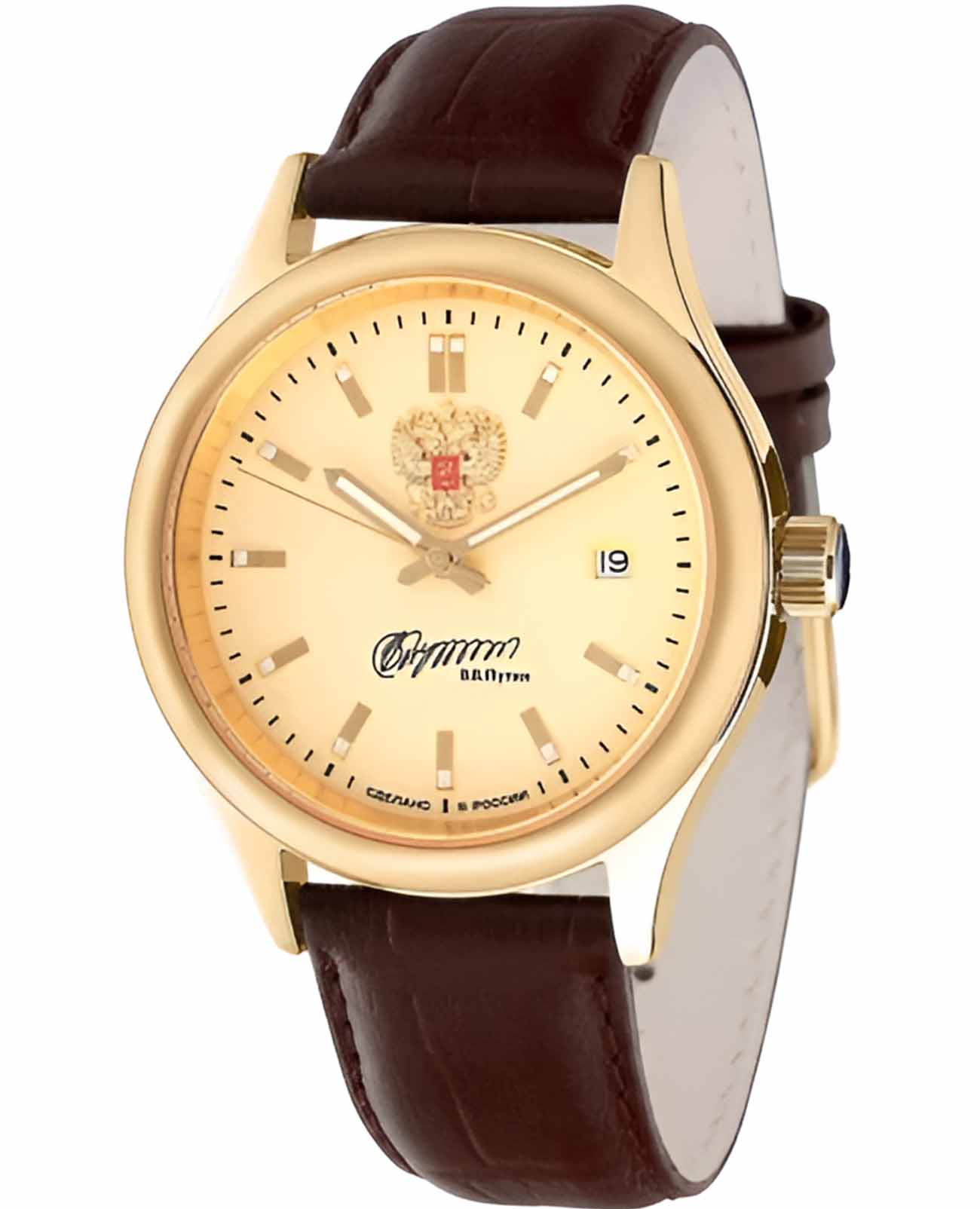 Российские механические наручные часы Слава 1859005/300-8215, которые станут идеальным аксессуаром для повседневного ношения. Эти часы сочетают в себе элегантность и практичность, предлагая безупречный стиль и надежность. Оснащенные механизмом Miyota 8215 с автоподзаводом, они обеспечивают точность и долговечность. Стальной корпус с IP-покрытиемIP-покрытиеМетод ионного напыления. Демонстрирует повышенную устойчивость к истиранию, окислению и химическим веществам. Под воздействием высокого давления и температуры около 1500°C молекулы металла надёжно соединяются с частицами корпуса часов. и сапфировым стекломСапфировое стеклоПрочный и надёжный материал из кристалла сапфира синтетического происхождения, характеризующийся особой твёрдостью и устойчивостью к царапинам и повреждениям. защищает золотистый циферблат, выполненный по технологии Sunray. Стрелки в стиле Baton и метки с люминесцентным покрытиемЛюминесцентное покрытиеПозволяет считывать показания времени в темноте. Производители наносят на стрелки, часовые индексы, безель или поверхность циферблата светонакопительный состав, дающий холодное свечение. облегчают чтение времени даже в условиях слабого освещения. На циферблате изображены герб Российской Федерации и автограф В.В. Путина. Часы также имеют календарь с окошком даты на 3 часах и водозащиту до 50WR, что делает их надежными в различных условиях. Текстурированный кожаный ремешок с классической застежкой завершает этот изысканный образ.