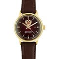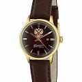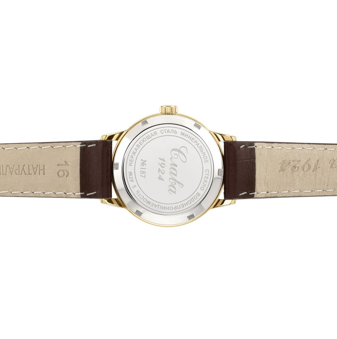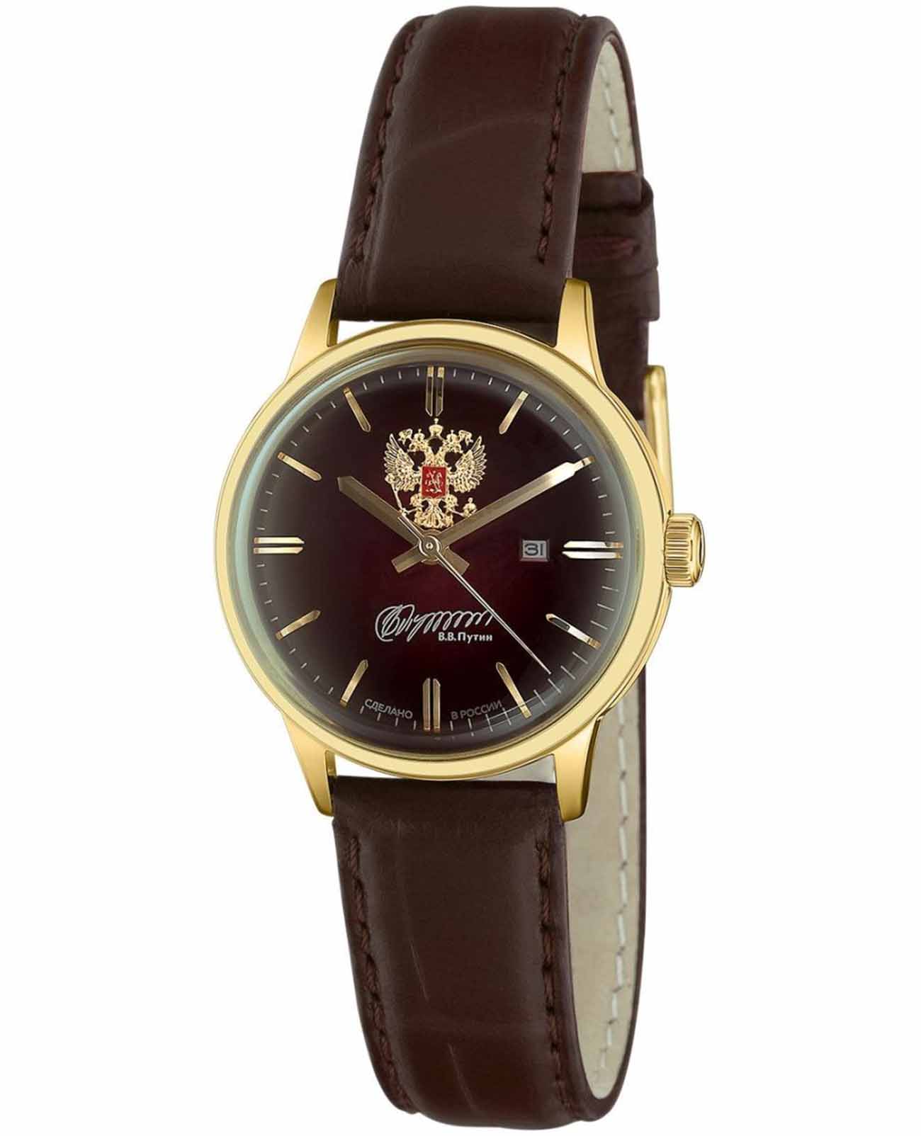 Российские механические наручные часы Слава 1879093/300-6Т15 станут стильным и надежным аксессуаром для вашего образа. Эти элегантные часы созданы с акцентом на высокое качество и изысканный дизайн. Оборудованные механизмом Miyota 6T15 с автоподзаводом, они обеспечивают точность и надежность, поддерживая запас хода до 40 часов. Часы заключены в прочный стальной корпус с IP-покрытиемIP-покрытиеМетод ионного напыления. Демонстрирует повышенную устойчивость к истиранию, окислению и химическим веществам. Под воздействием высокого давления и температуры около 1500°C молекулы металла надёжно соединяются с частицами корпуса часов. диаметром 32 мм и минеральным стекломМинеральное стеклоМинеральное стекло представляет собой искусственно выращенный минерал кварца. Такое стекло отличается особой устойчивостью к повреждениям и царапинам. Уступает по некоторым качествам сапфировому стеклу., что обеспечивает надежную защиту и долговечность. Коричневый циферблат украшен изображением герба Российской Федерации и автографом В.В. Путина. Широкие заостренные стрелки в стиле Baton и штриховые метки придают циферблату выразительность и читаемость. Часы оснащены календарем с окошком даты на 3 часах, что делает их еще более функциональными. Рифленая заводная головка и завинчивающаяся задняя крышка добавляют изделию надежности и комфорта в использовании. Завершает образ текстурированный кожаный ремешок коричневого цвета с классической застежкой, который обеспечивает удобную посадку на запястье. Благодаря водозащите до 50WR, эти часы подойдут для повседневного использования, сохраняя свой безупречный вид и функциональность.