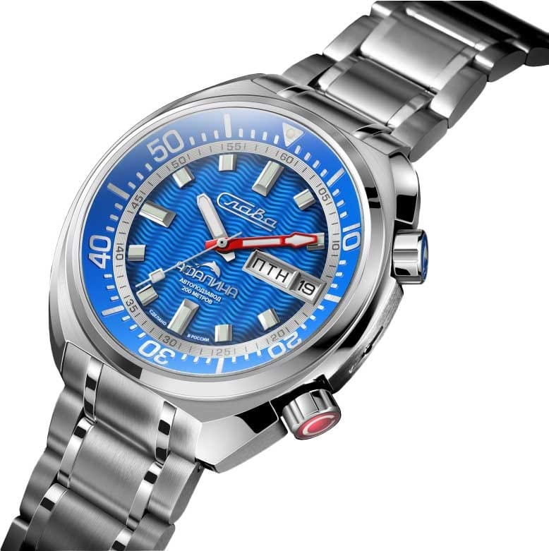 Коллекционные часы Слава Афалина 2430518/100-2427 — это превосходный выбор для тех, кто ценит стиль и функциональность. Модель из лимитированной серии, состоящей всего из 500 экземпляров, отличается прочным стальным корпусом и предназначена для любителей дайвинга. Часы оснащены надежным механическим механизмом с автоподзаводом и водозащитой до 200 метров, что делает их идеальными для подводных приключений. Синий циферблат дополняется стрелками с люминесцентным покрытиемЛюминесцентное покрытиеПозволяет считывать показания времени в темноте. Производители наносят на стрелки, часовые индексы, безель или поверхность циферблата светонакопительный состав, дающий холодное свечение. для отличной видимости в условиях низкой освещенности, а сапфировое стеклоСапфировое стеклоПрочный и надёжный материал из кристалла сапфира синтетического происхождения, характеризующийся особой твёрдостью и устойчивостью к царапинам и повреждениям. с антибликовым покрытиемАнтибликовое покрытиеСлой оксида металла в 0,13-0,3 микрон, благодаря которому стекло часов не бликует и не отражает свет. Антибликовое покрытие уменьшает отражение света в 10 раз, обеспечивая отличную читаемость показателей циферблата. защищает от царапин и бликов. Основная заводная головка расположена на корпусе ближе к отметке ''4 часа'', она позволяет настраивать время и заводить часы перед погружением. С помощью второй головки, расположенной у отметки ''2 часа'', можно управлять вращающимся внутренним кольцом безеляБезельВнешний ободок, закрепляющий стекло. В спортивных часах так называется поворотное кольцо с делениями на циферблате, выполняет роль таймера – замеряет отрезки времени на шкале. Неподвижный безель – элемент декора. Однонаправленно вращающийся безель на дайверских часах позволяет фиксировать моменты погружения и выныривания на поверхность. с PVDPVDУльтратонкое покрытие наносится в технике вакуумного напыления, сочетает в себе нитрид титана особой прочности со слоем золота или оксида хрома. Несёт в себе декоративную или защитную функцию. покрытием синего цвета и фиксировать его в нужном положении. Окошко даты и дня недели удобно расположено на отметке "3 часа", а профессиональная "дайвинг-застежка" стального браслета имеет удлинение для гидрокостюма. Особая забота о природе: часть средств от продажи данной модели перечисляется в центр спасения дельфинов "Дельфа". Часы серии "Афалина" — это не только функциональный аксессуар, но и символ вашей поддержки благородного дела.