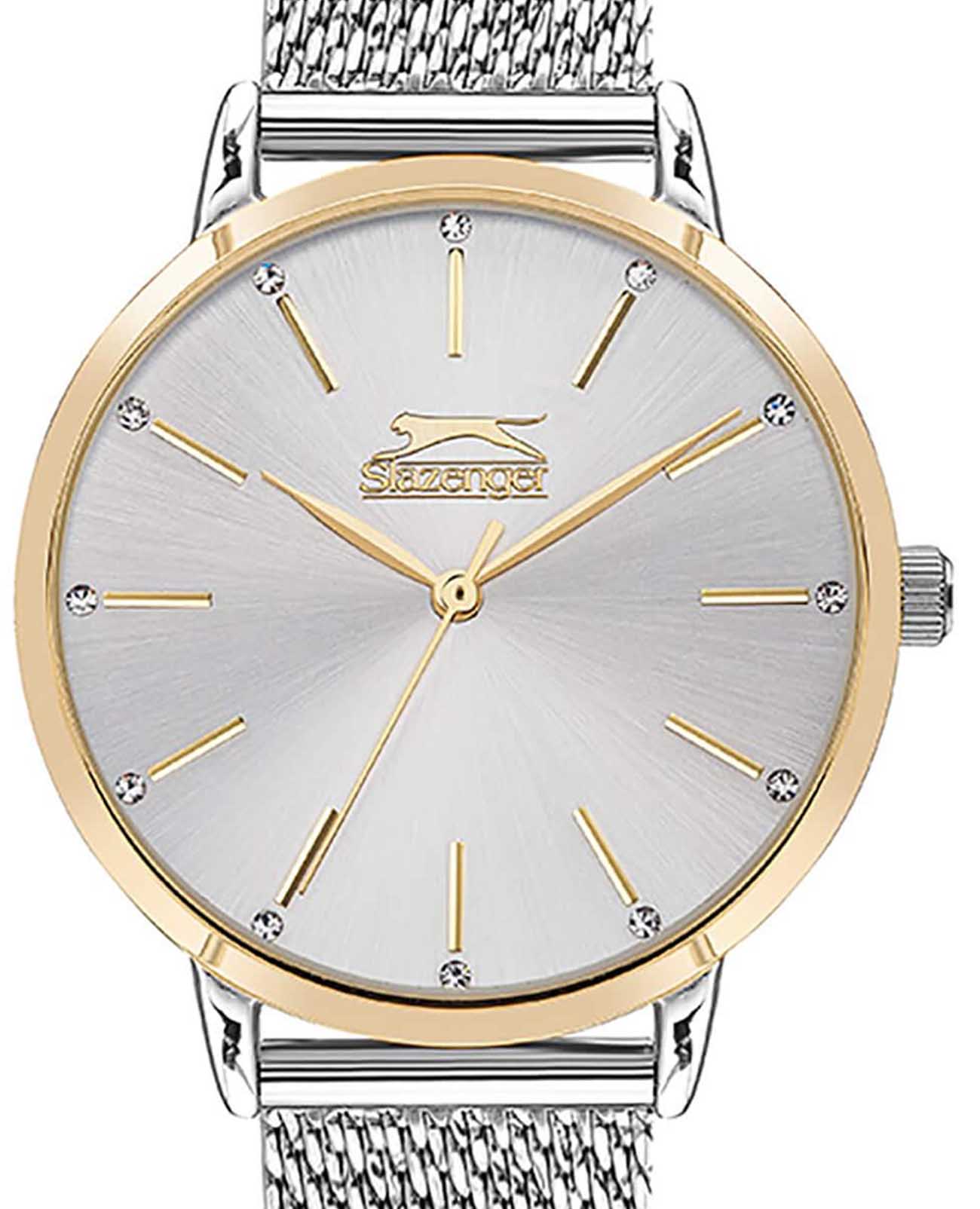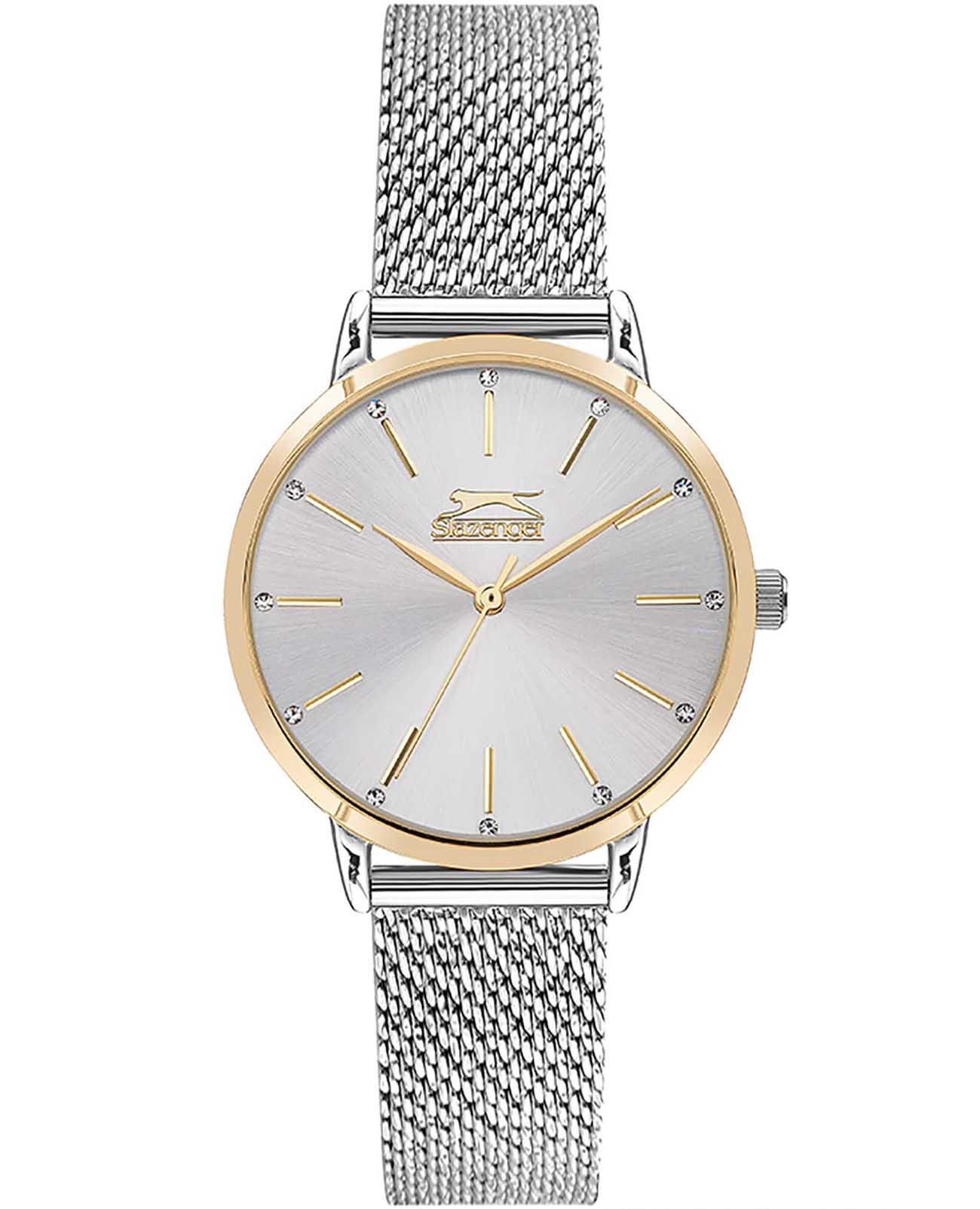 Slazenger SL.09.2047.3.02 – элегантные женские часы, сочетающие стильный дизайн и функциональность. Корпус диаметром 35 мм и толщиной 9 мм выполнен из суперметалла, обеспечивающего прочность и долговечность. Циферблат защищён минеральным стекломМинеральное стеклоМинеральное стекло представляет собой искусственно выращенный минерал кварца. Такое стекло отличается особой устойчивостью к повреждениям и царапинам. Уступает по некоторым качествам сапфировому стеклу., устойчивым к царапинам и украшен фианитами. БезельБезельВнешний ободок, закрепляющий стекло. В спортивных часах так называется поворотное кольцо с делениями на циферблате, выполняет роль таймера – замеряет отрезки времени на шкале. Неподвижный безель – элемент декора. Однонаправленно вращающийся безель на дайверских часах позволяет фиксировать моменты погружения и выныривания на поверхность. с IP-покрытиемIP-покрытиеМетод ионного напыления. Демонстрирует повышенную устойчивость к истиранию, окислению и химическим веществам. Под воздействием высокого давления и температуры около 1500°C молекулы металла надёжно соединяются с частицами корпуса часов.. Часы оснащены точным кварцевым механизмом, обеспечивающим надёжное отображение времени. Браслет из суперметалла миланского плетения на раскладном замкеРаскладной замокДанный вариант застежки используется только на часах с металлическим браслетом. Отличительная особенность такого крепления в том, что длина браслета становится универсальной и вы можете самостоятельно отрегулировать нужный вам размер – застежка просто двигается по браслету часов., обеспечивающей комфортное ношение и надёжную фиксацию на запястье. Водозащита до 30 метров (3 ATM) защищает часы от случайных брызг и дождя, делая их подходящими для повседневного использования.