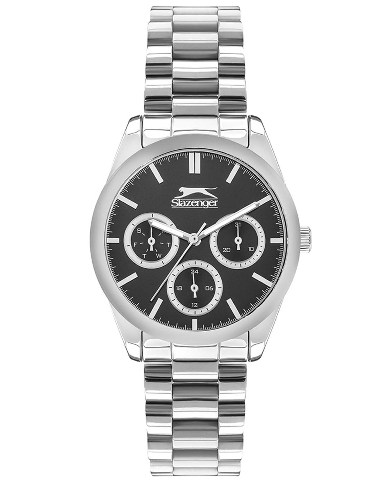 Женские наручные часы Slazenger SL.09.2063.4.01 сочетают в себе классический дизайн и высокое качество исполнения. Модель обладает круглым корпусом диаметром 36 мм, изготовленным из суперметалла с серебристым покрытием, что обеспечивает устойчивость к внешним воздействиям. Браслет выполнен из суперметалла на раскладной застёжкеРаскладная застёжкаТакой тип застёжки используется только на браслетах из металла. Она никогда не раскрывается полностью, происходит разделение на 2 и более частей. Раскладывающая застёжка снизит вероятность потери часов к минимуму.. Черный циферблат украшен логотипом бренда и метками времени. Имеются дополнительные малые циферблаты для отображения даты, дня недели и текущего времени в 24-часовом формате. Для защиты используется минеральное стеклоМинеральное стеклоМинеральное стекло представляет собой искусственно выращенный минерал кварца. Такое стекло отличается особой устойчивостью к повреждениям и царапинам. Уступает по некоторым качествам сапфировому стеклу., обеспечивающее прочную защиту от царапин. Стрелки и метки имеют люминесцентное покрытиеЛюминесцентное покрытиеПозволяет считывать показания времени в темноте. Производители наносят на стрелки, часовые индексы, безель или поверхность циферблата светонакопительный состав, дающий холодное свечение., что позволяет легко читать время в темноте. Часы работают на японском кварцевом механизме, который обеспечивает точность хода без необходимости подзаводки. Водонепроницаемость часов составляет 3 атмосферы (WR30), что позволяет защитить корпус от случайных брызг или капель дождя.