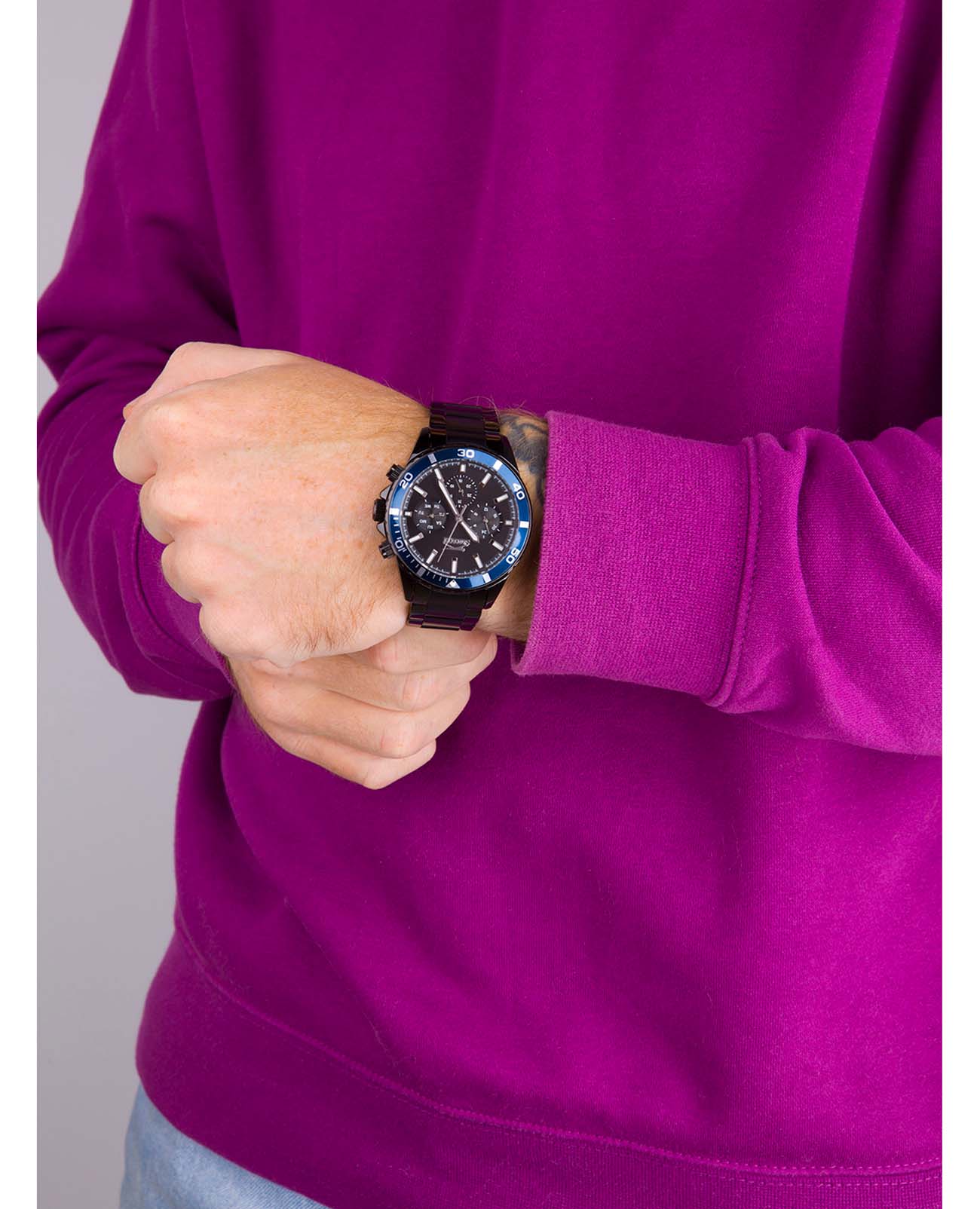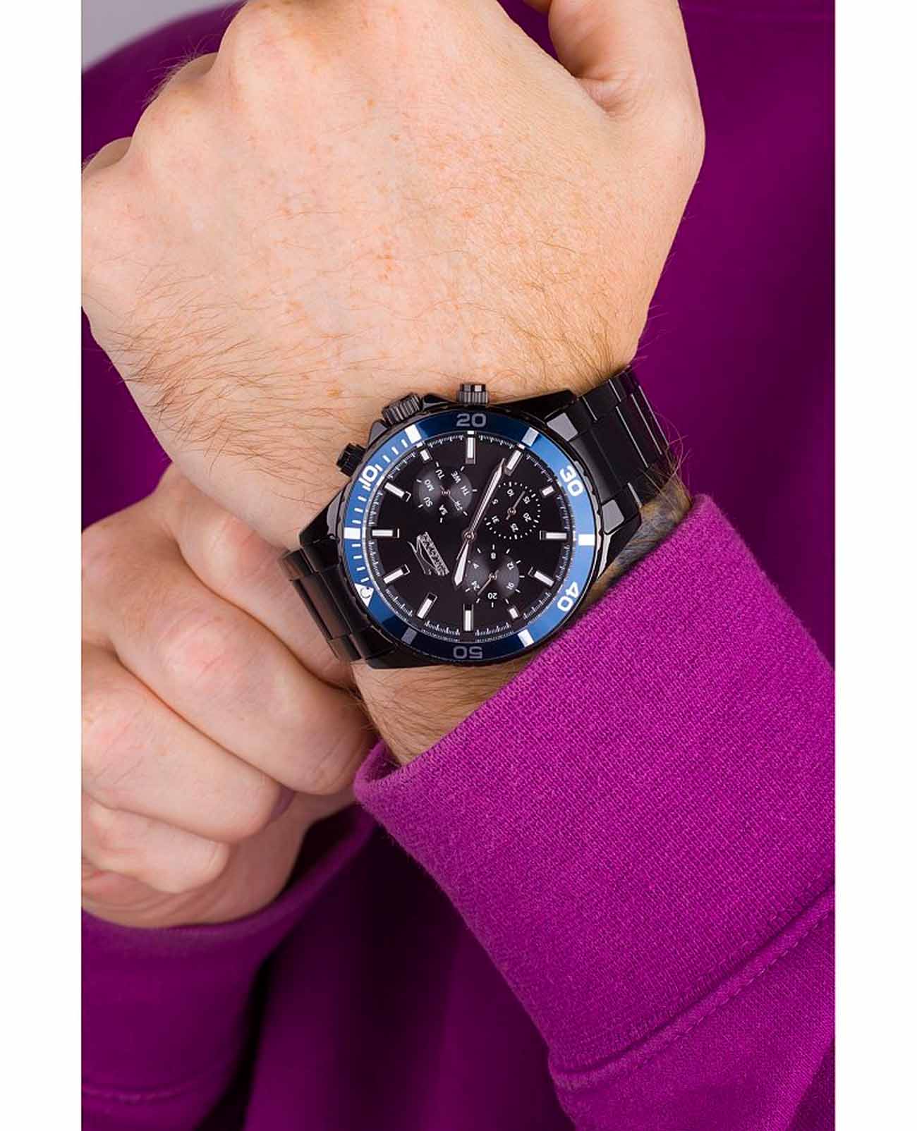 Циферблат черного цвета декорирован стрелками с люминесцентным покрытиемЛюминесцентное покрытиеПозволяет считывать показания времени в темноте. Производители наносят на стрелки, часовые индексы, безель или поверхность циферблата светонакопительный состав, дающий холодное свечение., которые обеспечивают читаемость времени даже в условиях недостаточной освещенности. Для защиты используется минеральное стеклоМинеральное стеклоМинеральное стекло представляет собой искусственно выращенный минерал кварца. Такое стекло отличается особой устойчивостью к повреждениям и царапинам. Уступает по некоторым качествам сапфировому стеклу., обеспечивающее прочную защиту от царапин. БезельБезельВнешний ободок, закрепляющий стекло. В спортивных часах так называется поворотное кольцо с делениями на циферблате, выполняет роль таймера – замеряет отрезки времени на шкале. Неподвижный безель – элемент декора. Однонаправленно вращающийся безель на дайверских часах позволяет фиксировать моменты погружения и выныривания на поверхность. с IP-покрытиемIP-покрытиеМетод ионного напыления. Демонстрирует повышенную устойчивость к истиранию, окислению и химическим веществам. Под воздействием высокого давления и температуры около 1500°C молекулы металла надёжно соединяются с частицами корпуса часов.. Часы работают на кварцевом механизме, что гарантирует точное время без необходимости подзаводки. Модель также оснащена функцией отображения даты, делая её практичной для повседневного использования. Браслет выполнен из суперметалла с IP-покрытиемIP-покрытиеМетод ионного напыления. Демонстрирует повышенную устойчивость к истиранию, окислению и химическим веществам. Под воздействием высокого давления и температуры около 1500°C молекулы металла надёжно соединяются с частицами корпуса часов. на раскладной застёжкеРаскладная застёжкаТакой тип застёжки используется только на браслетах из металла. Она никогда не раскрывается полностью, происходит разделение на 2 и более частей. Раскладывающая застёжка снизит вероятность потери часов к минимуму., гарантирующей комфортное ношение и безопасность. Водонепроницаемость часов достигает 5 атмосфер (WR50), что позволяет использовать их во время плавания, однако не рекомендуется для дайвинга или других водных видов спорта. Толщина корпуса составляет 11 мм, а производитель предоставляет гарантию сроком 12 месяцев.