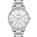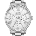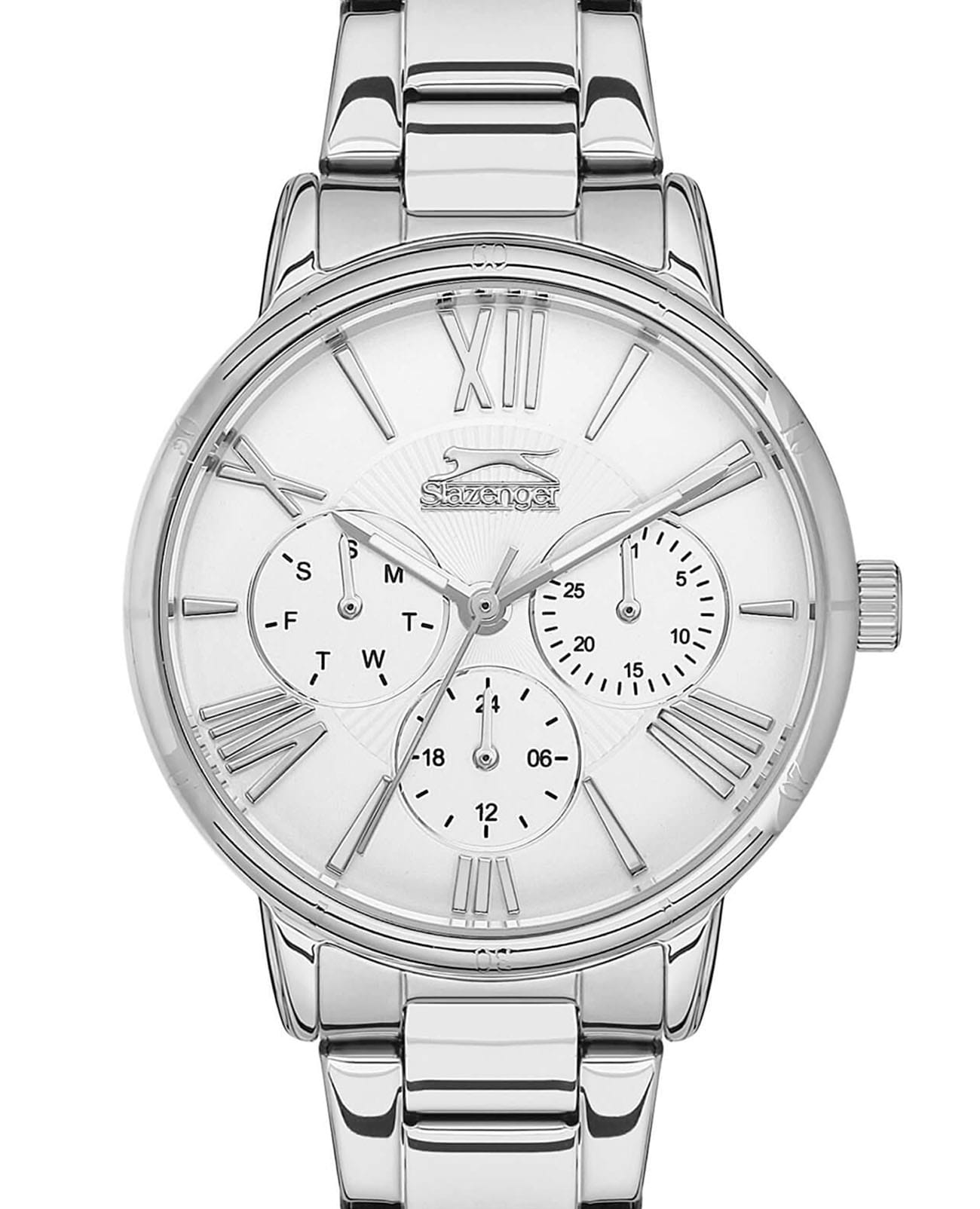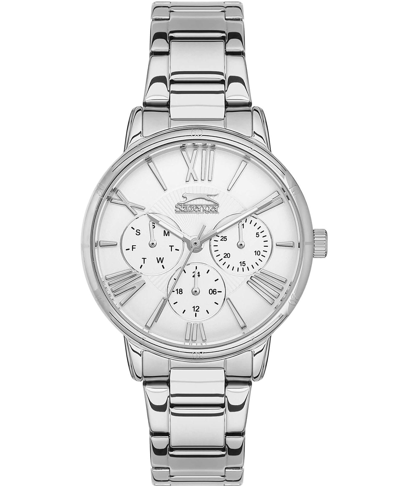 Женские наручные часы Slazenger SL.09.2072.4.01 сочетают в себе элегантность и практичность. Модель обладает круглым корпусом диаметром 35 мм, изготовленным из суперметалла, что обеспечивает высокую устойчивость к внешним воздействиям. Браслет выполнен из того же материала и оснащен раскладной застежкойРаскладной замокДанный вариант застежки используется только на часах с металлическим браслетом. Отличительная особенность такого крепления в том, что длина браслета становится универсальной и вы можете самостоятельно отрегулировать нужный вам размер – застежка просто двигается по браслету часов., гарантирующей комфортное ношение и безопасность. Серебристый циферблат украшен малыми циферблатами, которые отображают дату, день недели и текущее время в 24-часовом формате. Для защиты используется минеральное стеклоМинеральное стеклоМинеральное стекло представляет собой искусственно выращенный минерал кварца. Такое стекло отличается особой устойчивостью к повреждениям и царапинам. Уступает по некоторым качествам сапфировому стеклу., обеспечивающее прочную защиту от царапин. Стрелки с люминесцентным покрытиемЛюминесцентное покрытиеПозволяет считывать показания времени в темноте. Производители наносят на стрелки, часовые индексы, безель или поверхность циферблата светонакопительный состав, дающий холодное свечение.. Часы работают на кварцевом механизме, что гарантирует точное время без необходимости подзаводки. Водонепроницаемость достигает 3 атмосфер (WR30), что позволяет использовать их при контакте с брызгами воды, однако не рекомендуется для плавания или дайвинга.