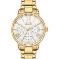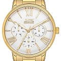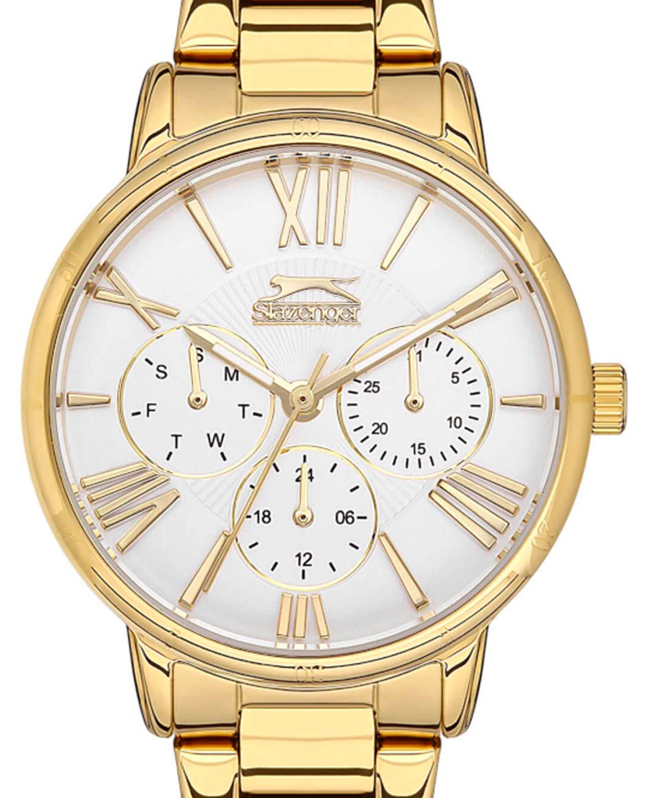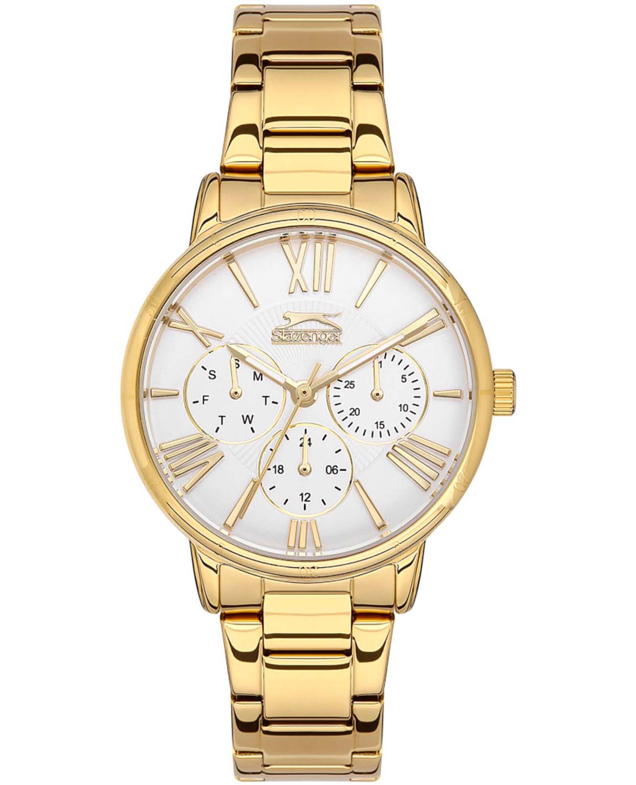 Женские наручные часы Slazenger SL.09.2072.4.03 сочетают в себе элегантный дизайн и функциональность. Модель обладает круглым корпусом диаметром 35 мм, изготовленным из суперметалла с IP-покрытиемIP-покрытиеМетод ионного напыления. Демонстрирует повышенную устойчивость к истиранию, окислению и химическим веществам. Под воздействием высокого давления и температуры около 1500°C молекулы металла надёжно соединяются с частицами корпуса часов., что обеспечивает высокую устойчивость к внешним воздействиям. Браслет выполнен из того же материала и оснащен раскладной застежкойРаскладной замокДанный вариант застежки используется только на часах с металлическим браслетом. Отличительная особенность такого крепления в том, что длина браслета становится универсальной и вы можете самостоятельно отрегулировать нужный вам размер – застежка просто двигается по браслету часов., и гарантирует комфортное ношение и безопасность. Циферблат украшен малыми циферблатами, которые отображают дату, день недели и текущее время в 24-часовом формате . Для защиты используется минеральное стеклоМинеральное стеклоМинеральное стекло представляет собой искусственно выращенный минерал кварца. Такое стекло отличается особой устойчивостью к повреждениям и царапинам. Уступает по некоторым качествам сапфировому стеклу., обеспечивающее прочную защиту от царапин. Часы работают на кварцевом механизме, что гарантирует точное время без необходимости подзаводки. Водонепроницаемость достигает 3 атмосфер (WR30), что позволяет использовать их при контакте с брызгами воды, однако не рекомендуется для плавания или дайвинга.