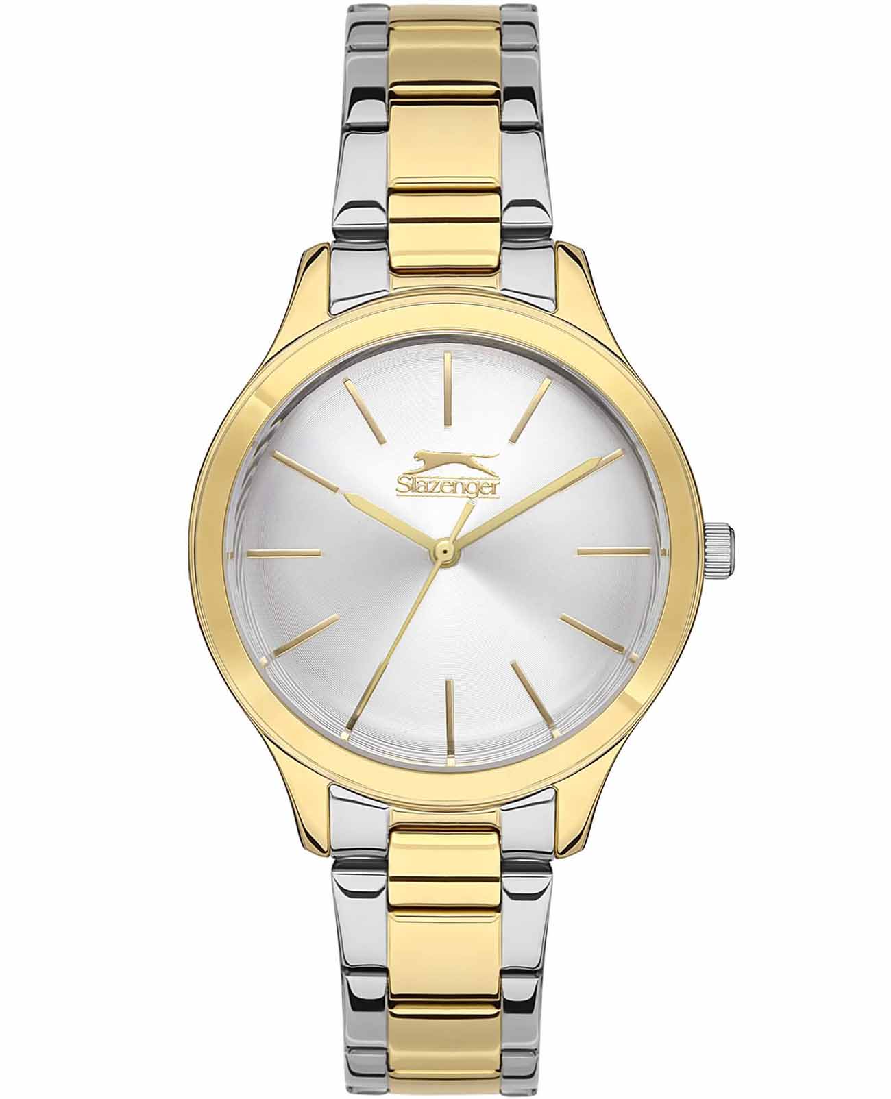 Часы Slazenger SL.09.2101.3.05 станут элегантным дополнением вашего образа. Изящный серебристый циферблат заключен в серебристый корпус диаметром 36 мм, выполненный из прочного суперметалла и безельБезельВнешний ободок, закрепляющий стекло. В спортивных часах так называется поворотное кольцо с делениями на циферблате, выполняет роль таймера – замеряет отрезки времени на шкале. Неподвижный безель – элемент декора. Однонаправленно вращающийся безель на дайверских часах позволяет фиксировать моменты погружения и выныривания на поверхность. цвета желтого золота из суперметалла с IP-покрытиемIP-покрытиеМетод ионного напыления. Демонстрирует повышенную устойчивость к истиранию, окислению и химическим веществам. Под воздействием высокого давления и температуры около 1500°C молекулы металла надёжно соединяются с частицами корпуса часов.. Эти женские часы оснащены надежным кварцевым механизмом и защищены от воды на уровне 3 АТМ, что делает их подходящими для повседневного использования. Серебристый браслет из суперметалла с частичным IP-покрытиемIP-покрытиеМетод ионного напыления. Демонстрирует повышенную устойчивость к истиранию, окислению и химическим веществам. Под воздействием высокого давления и температуры около 1500°C молекулы металла надёжно соединяются с частицами корпуса часов. цвета желтого золота и с раскладной застёжкойРаскладная застёжкаТакой тип застёжки используется только на браслетах из металла. Она никогда не раскрывается полностью, происходит разделение на 2 и более частей. Раскладывающая застёжка снизит вероятность потери часов к минимуму. обеспечивает комфортное прилегание на запястье. Минеральное стеклоМинеральное стеклоМинеральное стекло представляет собой искусственно выращенный минерал кварца. Такое стекло отличается особой устойчивостью к повреждениям и царапинам. Уступает по некоторым качествам сапфировому стеклу. гарантирует защиту от царапин.