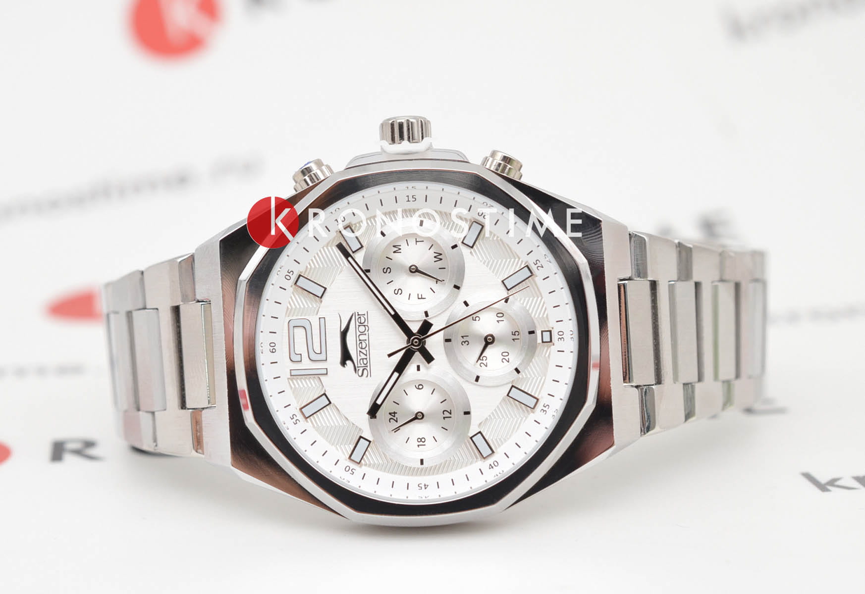 Часы Slazenger SL.09.2106.2.01 представляют собой идеальное сочетание элегантности и функциональности для стильных мужчин. Их серебристый циферблат, защищенный прочным минеральным стекломМинеральное стеклоМинеральное стекло представляет собой искусственно выращенный минерал кварца. Такое стекло отличается особой устойчивостью к повреждениям и царапинам. Уступает по некоторым качествам сапфировому стеклу., обрамлен корпусом из суперметалла диаметром 41 мм. Кварцевый механизм гарантирует точность, а водозащита 5 ATM позволяет не волноваться о случайных брызгах. Стальной браслет из суперметалла с раскладной застёжкойРаскладная застёжкаТакой тип застёжки используется только на браслетах из металла. Она никогда не раскрывается полностью, происходит разделение на 2 и более частей. Раскладывающая застёжка снизит вероятность потери часов к минимуму. придает часовому изделию современный и изысканный вид. Функции 24-часового указателя времени, а также отображение даты и дня недели обеспечивают дополнительное удобство в повседневной жизни. Люминесцентное покрытиеЛюминесцентное покрытиеПозволяет считывать показания времени в темноте. Производители наносят на стрелки, часовые индексы, безель или поверхность циферблата светонакопительный состав, дающий холодное свечение. на стрелках и метках обеспечивает удобство считывания времени в темное время суток.