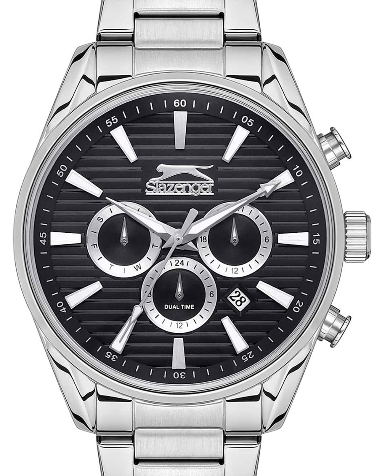 Мужские наручные часы Slazenger SL.09.2111.2.02 сочетают в себе классический дизайн и надежность современных технологий. Модель обладает круглым корпусом диаметром 44 мм, изготовленным из стали, что обеспечивает высокую устойчивость к внешним воздействиям. Браслет выполнен из металла с раскладной застежкойРаскладной замокДанный вариант застежки используется только на часах с металлическим браслетом. Отличительная особенность такого крепления в том, что длина браслета становится универсальной и вы можете самостоятельно отрегулировать нужный вам размер – застежка просто двигается по браслету часов., гарантирующей комфортное ношение и безопасность. Циферблат черного цвета декорирован стрелками с люминесцентным покрытиемЛюминесцентное покрытиеПозволяет считывать показания времени в темноте. Производители наносят на стрелки, часовые индексы, безель или поверхность циферблата светонакопительный состав, дающий холодное свечение., которые обеспечивают читаемость времени даже в условиях недостаточной освещенности. Для защиты используется минеральное стеклоМинеральное стеклоМинеральное стекло представляет собой искусственно выращенный минерал кварца. Такое стекло отличается особой устойчивостью к повреждениям и царапинам. Уступает по некоторым качествам сапфировому стеклу., обеспечивающее прочную защиту от царапин. Часы работают на кварцевом механизме, что гарантирует точное время без необходимости подзаводки. Модель также оснащена дополнительными функциями, такими как второй часовой поясВторой часовой поясФункция, позволяющая отображать время двух часовых поясов одновременно., отображение дня недели и текущего времени в 24-часовом формате, делая ее практичной для повседневного использования и путешествий. Водонепроницаемость часов достигает 5 атмосфер (WR50), что позволяет использовать их во время плавания, однако они не предназначены для дайвинга или других водных видов спорта. Толщина модели составляет 12 мм, а производитель предоставляет гарантию сроком 12 месяцев.