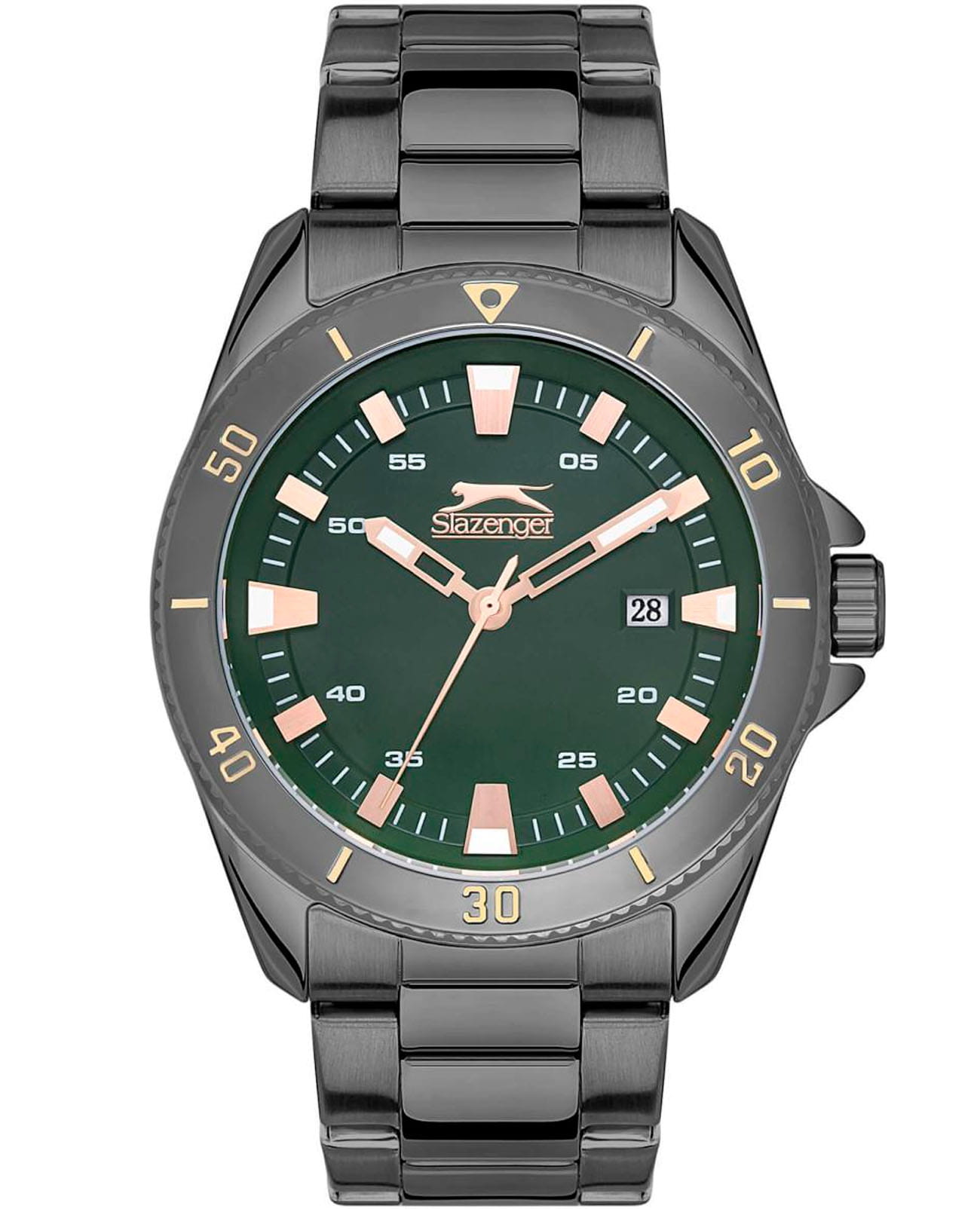 Мужские наручные часы Slazenger SL.09.2114.2.02 сочетают в себе классический дизайн и надежность современных технологий. Модель обладает круглым корпусом диаметром 44 мм. Корпус и браслет изготовлены из суперметалла с IP-покрытиемIP-покрытиеМетод ионного напыления. Демонстрирует повышенную устойчивость к истиранию, окислению и химическим веществам. Под воздействием высокого давления и температуры около 1500°C молекулы металла надёжно соединяются с частицами корпуса часов., что обеспечивает высокую устойчивость к внешним воздействиям. Браслет выполнен с раскладной застежкойРаскладной замокДанный вариант застежки используется только на часах с металлическим браслетом. Отличительная особенность такого крепления в том, что длина браслета становится универсальной и вы можете самостоятельно отрегулировать нужный вам размер – застежка просто двигается по браслету часов., гарантирующей комфортное ношение и безопасность. Циферблат декорирован стрелками с люминесцентным покрытиемЛюминесцентное покрытиеПозволяет считывать показания времени в темноте. Производители наносят на стрелки, часовые индексы, безель или поверхность циферблата светонакопительный состав, дающий холодное свечение., которые обеспечивают читаемость времени даже в условиях недостаточной освещенности. Для защиты используется минеральное стеклоМинеральное стеклоМинеральное стекло представляет собой искусственно выращенный минерал кварца. Такое стекло отличается особой устойчивостью к повреждениям и царапинам. Уступает по некоторым качествам сапфировому стеклу., обеспечивающее прочную защиту от царапин. Поворотный безельБезельВнешний ободок, закрепляющий стекло. В спортивных часах так называется поворотное кольцо с делениями на циферблате, выполняет роль таймера – замеряет отрезки времени на шкале. Неподвижный безель – элемент декора. Однонаправленно вращающийся безель на дайверских часах позволяет фиксировать моменты погружения и выныривания на поверхность.. Часы работают на кварцевом механизме, что гарантирует точное время без необходимости подзаводки. Модель также оснащена функцией отображения даты, делая ее практичной для повседневного использования. Водонепроницаемость часов достигает 5 атмосфер (WR50), что позволяет использовать их во время плавания, однако они не предназначены для дайвинга или других водных видов спорта.