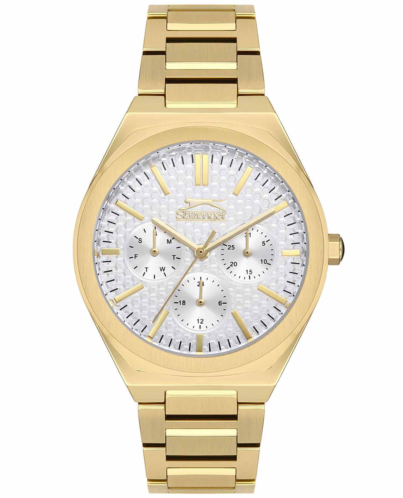 Элегантные женские часы Slazenger SL.09.2138.4.02 воплощают в себе утонченный стиль и функциональность. Их изящный круглый корпус из суперметалла с золотистым IP-покрытиемIP-покрытиеМетод ионного напыления. Демонстрирует повышенную устойчивость к истиранию, окислению и химическим веществам. Под воздействием высокого давления и температуры около 1500°C молекулы металла надёжно соединяются с частицами корпуса часов. гармонично сочетается с изысканным белым циферблатом, создавая неповторимый образ. Минималистичный дизайн подчеркивает чистоту линий и внимание к деталям. Циферблат защищен минеральным стекломМинеральное стеклоМинеральное стекло представляет собой искусственно выращенный минерал кварца. Такое стекло отличается особой устойчивостью к повреждениям и царапинам. Уступает по некоторым качествам сапфировому стеклу., устойчивым к царапинам. Часы имеют надежный кварцевый механизм, обеспечивающий точность хода.  Часы оснащены  24-часовым указателем времени, а также дней недели и даты - на дополнительных малых циферблатах. Золотистый браслет из суперметалла IP-покрытиемIP-покрытиеМетод ионного напыления. Демонстрирует повышенную устойчивость к истиранию, окислению и химическим веществам. Под воздействием высокого давления и температуры около 1500°C молекулы металла надёжно соединяются с частицами корпуса часов. идеально облегает запястье. Модель прекрасно дополнит как деловой, так и повседневный образ, став незаменимым аксессуаром для современной женщины, ценящей качество и стиль.