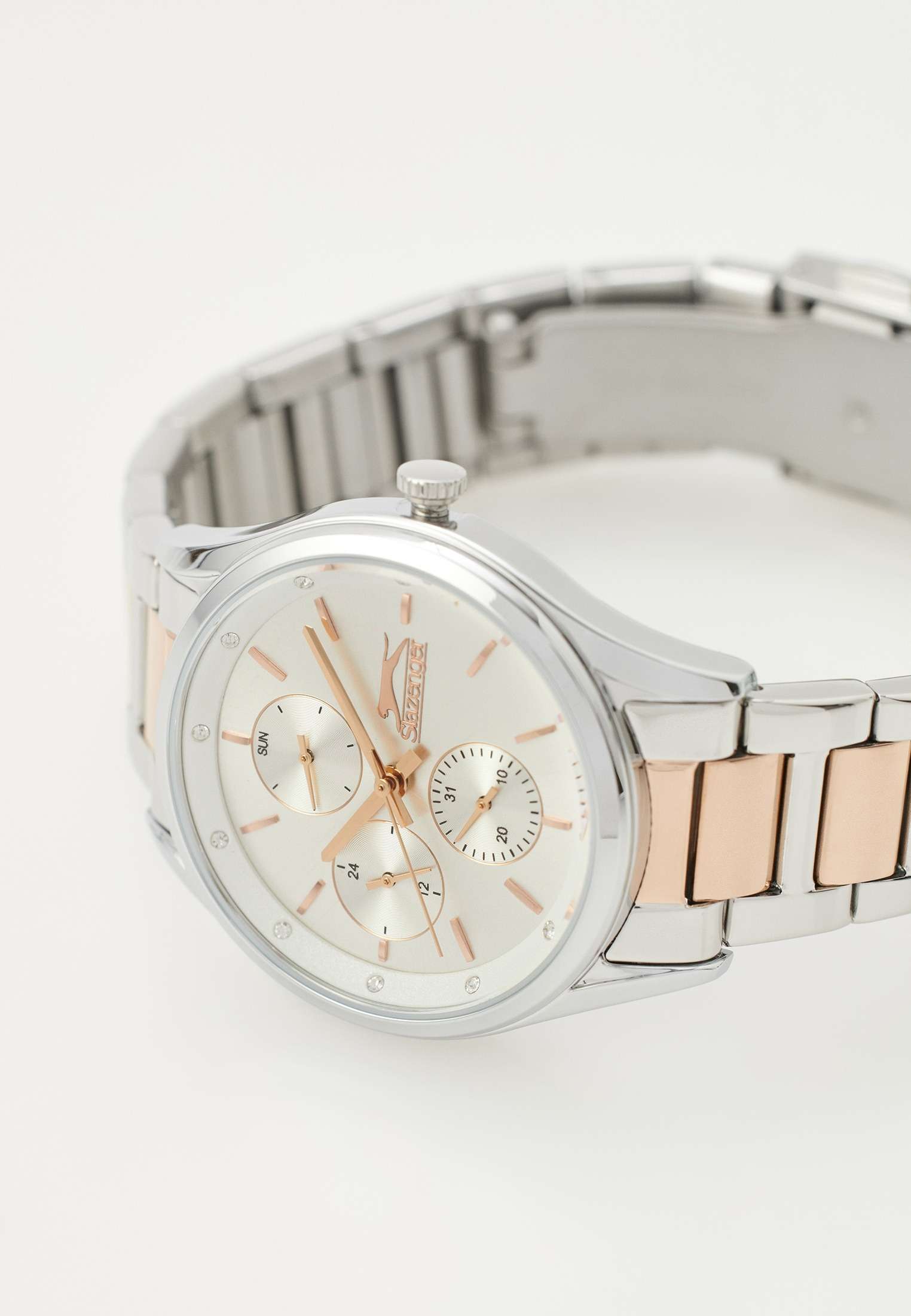 Часы Slazenger SL.09.2229.4.02 — это стильная и элегантная модель, созданная для современных женщин, ценящих изысканный дизайн и функциональность. Корпус выполнен из прочного металла серебристого цвета, что придает аксессуару особую утонченность. Циферблат украшен мерцающими кристаллами, а также оснащён дополнительными малыми циферблатами, которые отображают дату, день недели и время в 24-часовом формате. Минеральное стеклоМинеральное стеклоМинеральное стекло представляет собой искусственно выращенный минерал кварца. Такое стекло отличается особой устойчивостью к повреждениям и царапинам. Уступает по некоторым качествам сапфировому стеклу. надежно защищает часы от царапин, а водозащита уровня WR 30 позволяет не беспокоиться о случайном попадании влаги. Металлический браслет с частичным розово-золотистым IP-покрытиемIP-покрытиеМетод ионного напыления. Демонстрирует повышенную устойчивость к истиранию, окислению и химическим веществам. Под воздействием высокого давления и температуры около 1500°C молекулы металла надёжно соединяются с частицами корпуса часов. снабжён удобной раскладной застёжкойРаскладная застёжкаТакой тип застёжки используется только на браслетах из металла. Она никогда не раскрывается полностью, происходит разделение на 2 и более частей. Раскладывающая застёжка снизит вероятность потери часов к минимуму.. Диаметр корпуса составляет 36 мм, толщина — 9 мм, а вес — 82 грамма, что обеспечивает комфортное ношение в течение всего дня. Часы оснащены кварцевым механизмом.