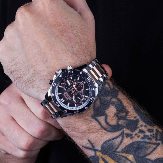 Часы Slazenger SL.09.2250.2.04 — это стильная и практичная модель, выполненная в элегантном серебристом цвете. Корпус изготовлен из металла, а на металлический браслет нанесено частичное розово-золотистое IP-покрытиеIP-покрытиеМетод ионного напыления. Демонстрирует повышенную устойчивость к истиранию, окислению и химическим веществам. Под воздействием высокого давления и температуры около 1500°C молекулы металла надёжно соединяются с частицами корпуса часов., что обеспечивает прочность и долговечность. На безельБезельВнешний ободок, закрепляющий стекло. В спортивных часах так называется поворотное кольцо с делениями на циферблате, выполняет роль таймера – замеряет отрезки времени на шкале. Неподвижный безель – элемент декора. Однонаправленно вращающийся безель на дайверских часах позволяет фиксировать моменты погружения и выныривания на поверхность. нанесено черное IP-покрытиеIP-покрытиеМетод ионного напыления. Демонстрирует повышенную устойчивость к истиранию, окислению и химическим веществам. Под воздействием высокого давления и температуры около 1500°C молекулы металла надёжно соединяются с частицами корпуса часов.. Минеральное стеклоМинеральное стеклоМинеральное стекло представляет собой искусственно выращенный минерал кварца. Такое стекло отличается особой устойчивостью к повреждениям и царапинам. Уступает по некоторым качествам сапфировому стеклу. надежно защищает синий циферблат от царапин и повреждений. Диаметр корпуса составляет 44 мм, а толщина — 11 мм, благодаря чему часы смотрятся солидно и современно. Модель оснащена кварцевым механизмом, отличающимся точностью и надежностью. На циферблате представлены дополнительные малые циферблаты для отображения второго часового поясаВторой часовой поясФункция, позволяющая отображать время двух часовых поясов одновременно., дня недели и времени в 24-часовом формате, а также имеется отдельное окошко даты. Для удобства использования в темное время суток предусмотрено люминесцентное покрытиеЛюминесцентное покрытиеПозволяет считывать показания времени в темноте. Производители наносят на стрелки, часовые индексы, безель или поверхность циферблата светонакопительный состав, дающий холодное свечение. стрелок и меток. Удобный металлический браслет шириной 22 мм снабжен раскладной застёжкойРаскладная застёжкаТакой тип застёжки используется только на браслетах из металла. Она никогда не раскрывается полностью, происходит разделение на 2 и более частей. Раскладывающая застёжка снизит вероятность потери часов к минимуму., обеспечивающей надежную фиксацию на запястье. Заводная головка оснащена защитой. Водозащита уровня WR 50 позволяет не снимать часы при мытье рук или попадании под дождь. Вес модели составляет 152 грамм.