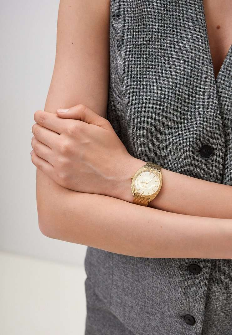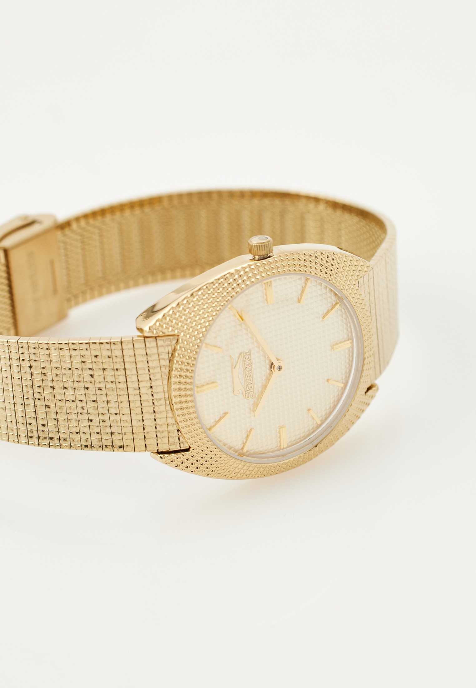 Часы Slazenger SL.09.2261.3.03 — это утонченное сочетание современного дизайна и классической элегантности. Изделие оснащено надежным кварцевым механизмом, который обеспечивает точность хода и простоту эксплуатации. Корпус из суперметалла с золотистым IP-покрытиемIP-покрытиеМетод ионного напыления. Демонстрирует повышенную устойчивость к истиранию, окислению и химическим веществам. Под воздействием высокого давления и температуры около 1500°C молекулы металла надёжно соединяются с частицами корпуса часов. гармонично сочетается с металлическим браслетом аналогичного оттенка и покрытия, подчеркивая изысканность аксессуара и его актуальность в модных тенденциях. Золотистый циферблат украшен изысканным гильоше Clous de Paris и дополнен лаконичными метками в виде штрихов, а также фирменным логотипом бренда. Минеральное стеклоМинеральное стеклоМинеральное стекло представляет собой искусственно выращенный минерал кварца. Такое стекло отличается особой устойчивостью к повреждениям и царапинам. Уступает по некоторым качествам сапфировому стеклу. надежно защищает циферблат от случайных царапин. Диаметр корпуса составляет 34 мм, толщина — 8 мм, ширина браслета — 18 мм, а вес часов — всего 54 г, благодаря чему аксессуар удобно сидит на запястье. Стальной браслет c раскладным замкомРаскладной замокДанный вариант застежки используется только на часах с металлическим браслетом. Отличительная особенность такого крепления в том, что длина браслета становится универсальной и вы можете самостоятельно отрегулировать нужный вам размер – застежка просто двигается по браслету часов. удобно фиксируется на запястье и подчёркивает современный характер часов. Водозащита 30WR позволяет не беспокоиться о случайных брызгах. Модель отличается отсутствием секундной стрелки и оснащена рифленой заводной головкой для легкой корректировки времени. Эти часы станут стильным завершением любого образа, подчеркивая индивидуальность и чувство вкуса обладателя.
