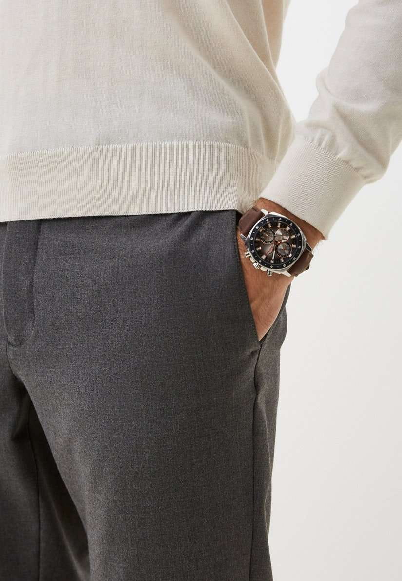 Slazenger SL.09.2293.2.06 — это стильные наручные часы, выполненные в современном дизайне и отлично подходящие для повседневного использования. Корпус диаметром 45 мм изготовлен из прочного металла и дополнен минеральным стекломМинеральное стеклоМинеральное стекло представляет собой искусственно выращенный минерал кварца. Такое стекло отличается особой устойчивостью к повреждениям и царапинам. Уступает по некоторым качествам сапфировому стеклу., которое защищает градиентный коричневый циферблат. Коричневый кожаный ремешок шириной 24 мм оснащён надежной классической застежкой, которая обеспечивает комфортную посадку на руке. Кварцевый механизм гарантирует точный ход, а водозащита уровня WR 50 позволяет не снимать часы во время мытья рук или под дождём. Модель оснащена люминесцентным покрытиемЛюминесцентное покрытиеПозволяет считывать показания времени в темноте. Производители наносят на стрелки, часовые индексы, безель или поверхность циферблата светонакопительный состав, дающий холодное свечение. стрелок и меток, что облегчает считывание времени в темноте. Дополнительные малые циферблаты отображают дату, день недели и текущее время в 24-часовом формате. Часы также оснащены заводной головкой с защитой и безелемБезельВнешний ободок, закрепляющий стекло. В спортивных часах так называется поворотное кольцо с делениями на циферблате, выполняет роль таймера – замеряет отрезки времени на шкале. Неподвижный безель – элемент декора. Однонаправленно вращающийся безель на дайверских часах позволяет фиксировать моменты погружения и выныривания на поверхность. с черным IP-покрытиемIP-покрытиеМетод ионного напыления. Демонстрирует повышенную устойчивость к истиранию, окислению и химическим веществам. Под воздействием высокого давления и температуры около 1500°C молекулы металла надёжно соединяются с частицами корпуса часов. и секундной разметкой. Вес изделия составляет 80 грамм.
