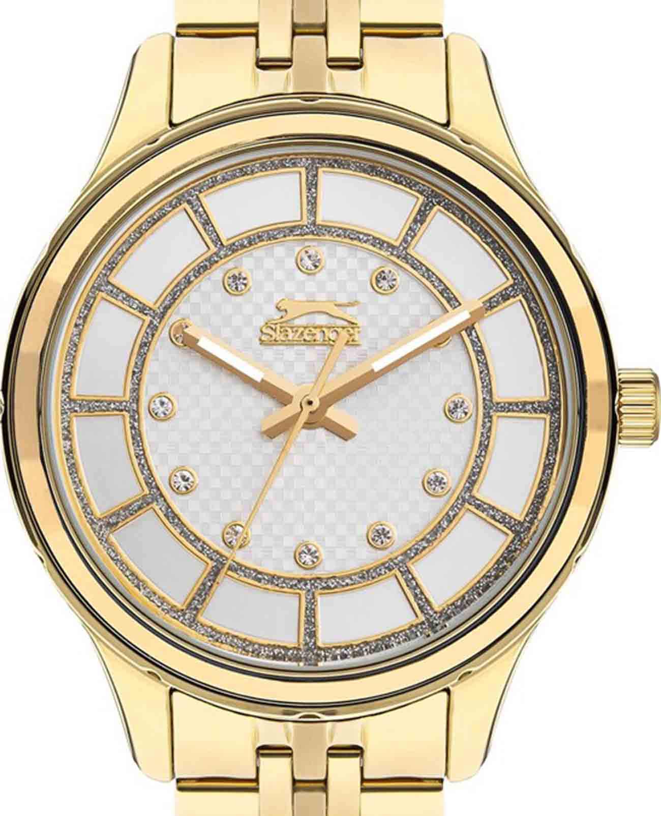 Женские наручные часы Slazenger SL.09.2295.3.06 — это элегантный аксессуар, который подчеркнет утончённый стиль своей обладательницы. Корпус диаметром 36 мм и толщиной 11,5 мм выполнен из прочного металла с золотистым IP-покрытиемIP-покрытиеМетод ионного напыления. Демонстрирует повышенную устойчивость к истиранию, окислению и химическим веществам. Под воздействием высокого давления и температуры около 1500°C молекулы металла надёжно соединяются с частицами корпуса часов. и надёжно защищён минеральным стекломМинеральное стеклоМинеральное стекло представляет собой искусственно выращенный минерал кварца. Такое стекло отличается особой устойчивостью к повреждениям и царапинам. Уступает по некоторым качествам сапфировому стеклу., устойчивым к царапинам. Серебристый циферблат украшен изящными кристаллами, придающими часам особый блеск и изысканность. Модель оснащена люминесцентным покрытиемЛюминесцентное покрытиеПозволяет считывать показания времени в темноте. Производители наносят на стрелки, часовые индексы, безель или поверхность циферблата светонакопительный состав, дающий холодное свечение. стрелок, что облегчает считывание времени в темноте. Особое внимание привлекает безельБезельВнешний ободок, закрепляющий стекло. В спортивных часах так называется поворотное кольцо с делениями на циферблате, выполняет роль таймера – замеряет отрезки времени на шкале. Неподвижный безель – элемент декора. Однонаправленно вращающийся безель на дайверских часах позволяет фиксировать моменты погружения и выныривания на поверхность. с золотистым IP-покрытиемIP-покрытиеМетод ионного напыления. Демонстрирует повышенную устойчивость к истиранию, окислению и химическим веществам. Под воздействием высокого давления и температуры около 1500°C молекулы металла надёжно соединяются с частицами корпуса часов.. Металлический браслет с золотистым IP-покрытиемIP-покрытиеМетод ионного напыления. Демонстрирует повышенную устойчивость к истиранию, окислению и химическим веществам. Под воздействием высокого давления и температуры около 1500°C молекулы металла надёжно соединяются с частицами корпуса часов. шириной 16 мм оснащён удобной раскладной застёжкойРаскладная застёжкаТакой тип застёжки используется только на браслетах из металла. Она никогда не раскрывается полностью, происходит разделение на 2 и более частей. Раскладывающая застёжка снизит вероятность потери часов к минимуму. для комфортной посадки на запястье. Кварцевый механизм обеспечивает точность хода, а водозащита уровня WR 30 защищает часы от случайных брызг. Для удобства в условиях плохой освещённости предусмотрена подсветка стрелок. Вес изделия составляет 95 граммов.