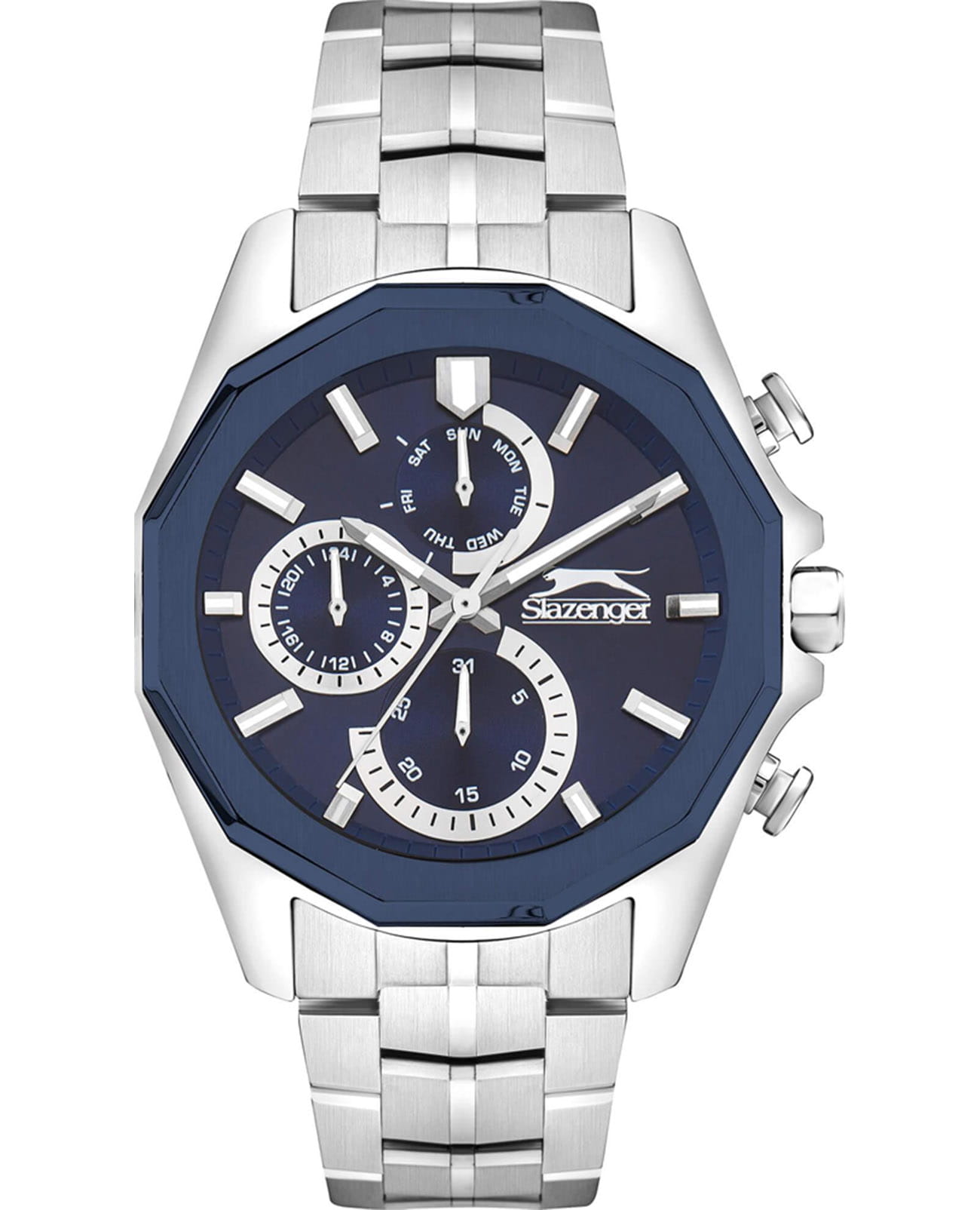 Мужские кварцевые часы Slazenger SL.09.2312.2.04 — это выразительный и функциональный аксессуар, сочетающий прочность, стиль и насыщенную комплектацию. Корпус выполнен из суперметалла с частичным IP-покрытиемIP-покрытиеМетод ионного напыления. Демонстрирует повышенную устойчивость к истиранию, окислению и химическим веществам. Под воздействием высокого давления и температуры около 1500°C молекулы металла надёжно соединяются с частицами корпуса часов. синего цвета, защищён минеральным стекломМинеральное стеклоМинеральное стекло представляет собой искусственно выращенный минерал кварца. Такое стекло отличается особой устойчивостью к повреждениям и царапинам. Уступает по некоторым качествам сапфировому стеклу.. Циферблат синего цвета оформлен с вынесенными малыми циферблатами для индикации дня недели, даты и времени в 24-часовом формате. Стрелки и метки оснащены люминесцентным покрытиемЛюминесцентное покрытиеПозволяет считывать показания времени в темноте. Производители наносят на стрелки, часовые индексы, безель или поверхность циферблата светонакопительный состав, дающий холодное свечение., обеспечивающим хорошую читаемость в темноте. Безель и гранёная заводная головка с защитой придают модели выразительный внешний вид. Браслет из суперметалла фиксируется на раскладной застёжкеРаскладная застёжкаТакой тип застёжки используется только на браслетах из металла. Она никогда не раскрывается полностью, происходит разделение на 2 и более частей. Раскладывающая застёжка снизит вероятность потери часов к минимуму., обеспечивая удобство и надёжность ношения. Водонепроницаемость 50 м позволяет использовать часы в повседневных условиях, защищая от случайных брызг и капель дождя. Модель подчёркивает индивидуальность владельца и идеально подходит как для повседневного, так и для делового образа.