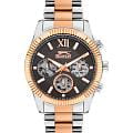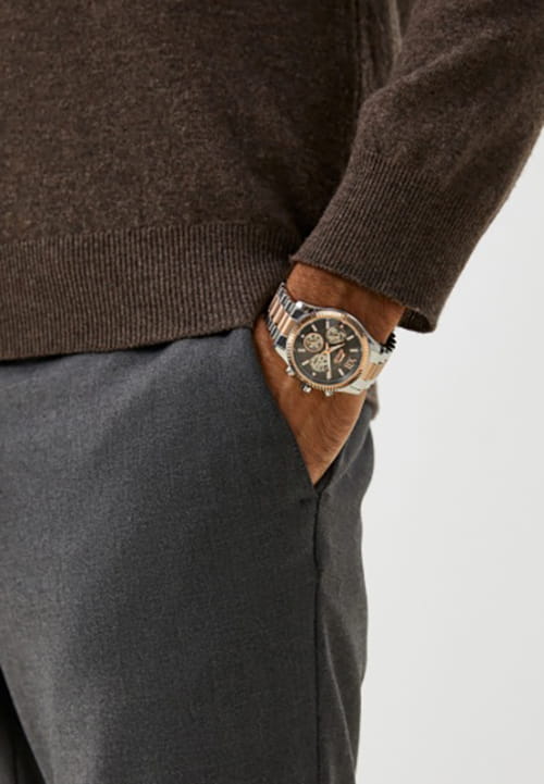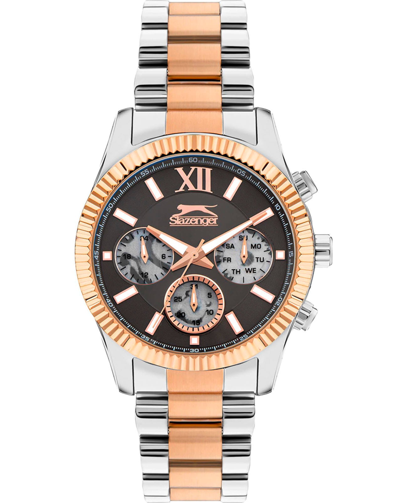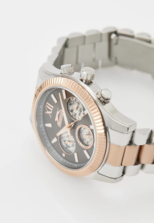 Мужские кварцевые часы Slazenger SL.09.2316.2.04 — это выразительный и функциональный аксессуар, сочетающий прочность, стиль и насыщенную комплектацию. Безель и браслет выполнены из суперметалла с IP-покрытиемIP-покрытиеМетод ионного напыления. Демонстрирует повышенную устойчивость к истиранию, окислению и химическим веществам. Под воздействием высокого давления и температуры около 1500°C молекулы металла надёжно соединяются с частицами корпуса часов.. Циферблат защищён минеральным стекломМинеральное стеклоМинеральное стекло представляет собой искусственно выращенный минерал кварца. Такое стекло отличается особой устойчивостью к повреждениям и царапинам. Уступает по некоторым качествам сапфировому стеклу. и оформлен с вынесенными малыми циферблатами для индикации дня недели, даты и времени в 24-часовом формате. Стрелки и метки оснащены люминесцентным покрытиемЛюминесцентное покрытиеПозволяет считывать показания времени в темноте. Производители наносят на стрелки, часовые индексы, безель или поверхность циферблата светонакопительный состав, дающий холодное свечение., обеспечивающим хорошую читаемость в темноте. Завинчивающаяся задняя крышка повышает надёжность конструкции. Браслет комбинированного цвета фиксируется на раскладной застёжкеРаскладная застёжкаТакой тип застёжки используется только на браслетах из металла. Она никогда не раскрывается полностью, происходит разделение на 2 и более частей. Раскладывающая застёжка снизит вероятность потери часов к минимуму., обеспечивая удобство и безопасность ношения. Водонепроницаемость 50 м позволяет использовать часы в повседневных условиях, защищая от случайных брызг и капель дождя. Модель подчёркивает индивидуальность владельца и идеально подходит как для повседневного, так и для делового образа.