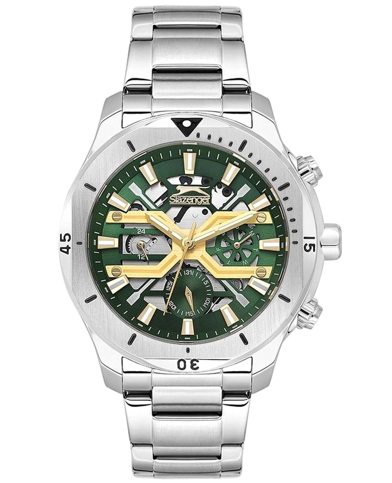 Мужские кварцевые часы Slazenger — это выразительный и функциональный аксессуар. Корпус диаметром 44 мм и толщиной 12 мм выполнен из суперметалла. Циферблат зелёного цвета частично скелетонизирован. Циферблат защищён минеральным стекломМинеральное стеклоМинеральное стекло представляет собой искусственно выращенный минерал кварца. Такое стекло отличается особой устойчивостью к повреждениям и царапинам. Уступает по некоторым качествам сапфировому стеклу.. Механизм — кварцевый калибр VX9JE1. Часы оснащены индикацией дня недели, даты и 12/24-часового формата времени. Часы оснащены браслетом из суперметалла с раскладной застёжкойРаскладная застёжкаТакой тип застёжки используется только на браслетах из металла. Она никогда не раскрывается полностью, происходит разделение на 2 и более частей. Раскладывающая застёжка снизит вероятность потери часов к минимуму.. Водонепроницаемость 50 м позволяет использовать часы в повседневных условиях. Гарантия — 12 месяцев. Идеальный выбор для тех, кто ценит стиль, функциональность и качество.