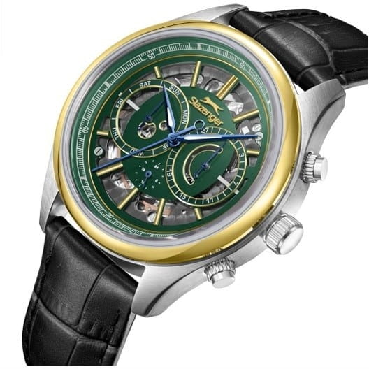 Мужские механические часы с автоподзаводом Slazenger — это выразительный и функциональный аксессуар. Корпус диаметром 41 мм и толщиной 16 мм выполнен из нержавеющей стали 316L. БезельБезельВнешний ободок, закрепляющий стекло. В спортивных часах так называется поворотное кольцо с делениями на циферблате, выполняет роль таймера – замеряет отрезки времени на шкале. Неподвижный безель – элемент декора. Однонаправленно вращающийся безель на дайверских часах позволяет фиксировать моменты погружения и выныривания на поверхность. с IP-покрытиемIP-покрытиеМетод ионного напыления. Демонстрирует повышенную устойчивость к истиранию, окислению и химическим веществам. Под воздействием высокого давления и температуры около 1500°C молекулы металла надёжно соединяются с частицами корпуса часов.. Циферблат зелёного цвета частично скелетонизирован, что позволяет наблюдать за работой механизма. Циферблат защищён минеральным стекломМинеральное стеклоМинеральное стекло представляет собой искусственно выращенный минерал кварца. Такое стекло отличается особой устойчивостью к повреждениям и царапинам. Уступает по некоторым качествам сапфировому стеклу.. Механизм — автоматический. Часы оснащены индикацией дня недели, даты и 12/24-часового формата времени. Прозрачная задняя крышка открывает вид на декорированный механизм. Часы оснащены кожаным ремешком с застёжкой «бабочка» с кнопкамиЗастёжка "бабочка"Такой вид застёжки дополняется предохранителями, помогающими избежать случайного раскрытия браслета. Обладают изящным исполнением. . Водонепроницаемость 100 м позволяет использовать часы для плавания и повседневного ношения. Гарантия — 12 месяцев. Идеальный выбор для тех, кто ценит стиль, функциональность и качество.