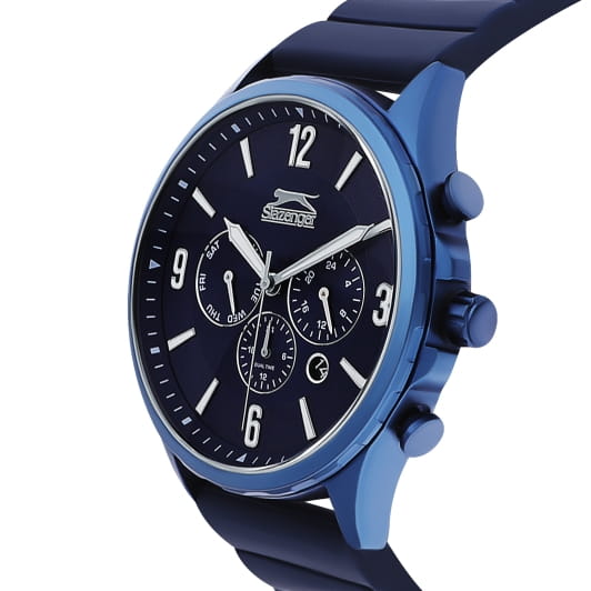 Мужские кварцевые часы Slazenger — это выразительный и функциональный аксессуар. Корпус диаметром 46 мм и толщиной 11 мм выполнен из суперметалла с IP-покрытиемIP-покрытиеМетод ионного напыления. Демонстрирует повышенную устойчивость к истиранию, окислению и химическим веществам. Под воздействием высокого давления и температуры около 1500°C молекулы металла надёжно соединяются с частицами корпуса часов.. Циферблат синего цвета оформлен индексами, стрелками и двумя вынесенными субциферблатами: для отображения дня недели и 24-часового формата времени. Окошко даты расположено между 4 и 5 часами. Присутствует указатель второго часового пояса (GMTВторой часовой поясФункция, позволяющая отображать время двух часовых поясов одновременно.). Циферблат защищён минеральным стекломМинеральное стеклоМинеральное стекло представляет собой искусственно выращенный минерал кварца. Такое стекло отличается особой устойчивостью к повреждениям и царапинам. Уступает по некоторым качествам сапфировому стеклу.. Часы оснащены силиконовым ремешком на классической пряжке. Водонепроницаемость 50 м позволяет использовать часы в повседневных условиях. Идеальный выбор для тех, кто ценит стиль и качество.