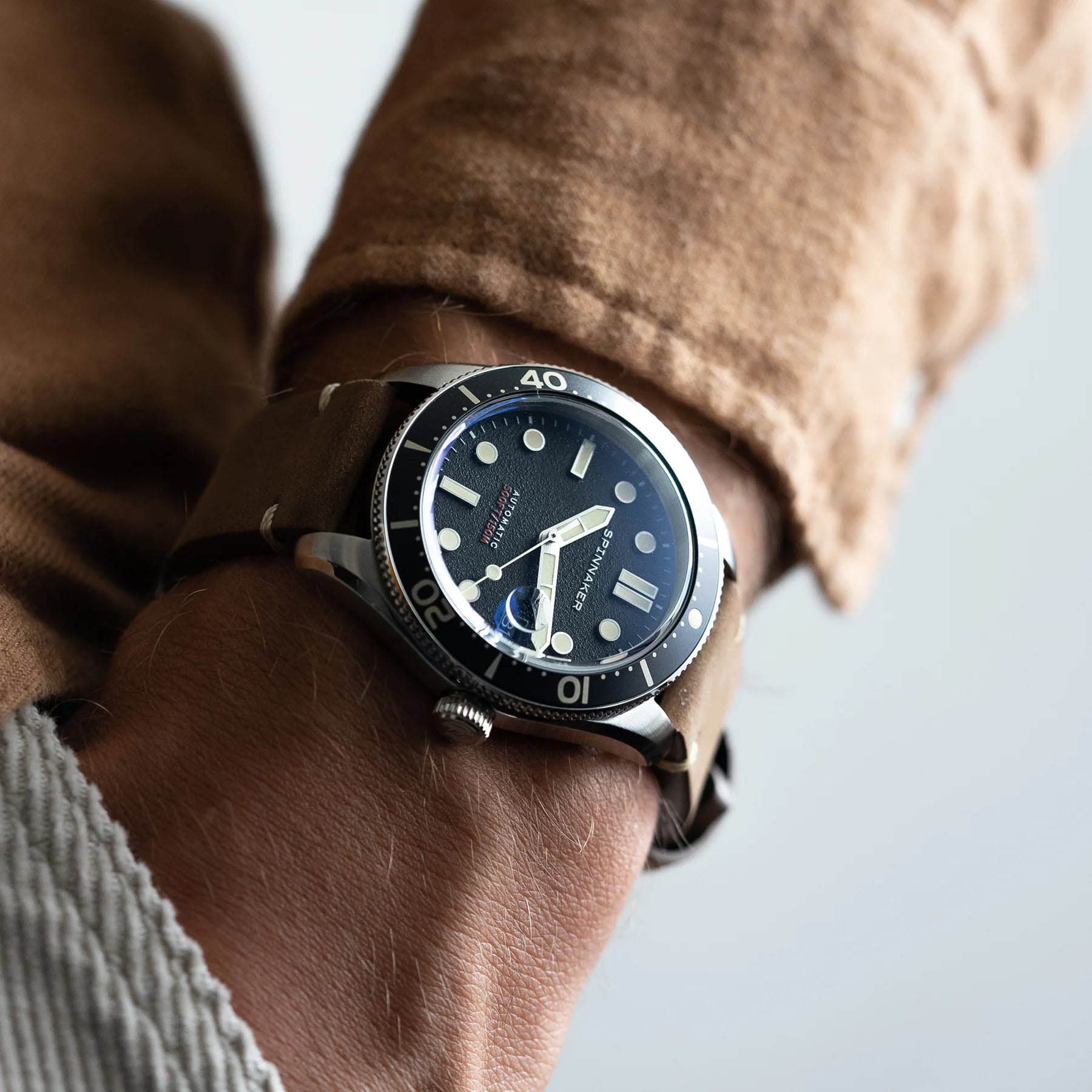 Мужские итальянские часы Spinnaker Croft SP-5100-01, механический механизм (автоматический калибр) с высокой точностью. Циферблат с люминесцентным покрытиемЛюминесцентное покрытиеПозволяет считывать показания времени в темноте. Производители наносят на стрелки, часовые индексы, безель или поверхность циферблата светонакопительный состав, дающий холодное свечение. стрелок и меток, дополнен сапфировым стекломСапфировое стеклоПрочный и надёжный материал из кристалла сапфира синтетического происхождения, характеризующийся особой твёрдостью и устойчивостью к царапинам и повреждениям., устойчивым к появлению царапин и обладающее высокой прозрачностью. Класс водозащиты: 150 метров, позволит плавать, нырять и заниматься другими водными видами спорта. Корпус часов изготовлен из усовершенствованной стали 316L. Апертура даты с увеличительным стеклом в позиции 3 часов. Коричневый кожаный ремешок толщиной 20 мм, стандартная застежка. Вращающийся стальной безельБезельВнешний ободок, закрепляющий стекло. В спортивных часах так называется поворотное кольцо с делениями на циферблате, выполняет роль таймера – замеряет отрезки времени на шкале. Неподвижный безель – элемент декора. Однонаправленно вращающийся безель на дайверских часах позволяет фиксировать моменты погружения и выныривания на поверхность. с PVD-покрытиемPVDУльтратонкое покрытие наносится в технике вакуумного напыления, сочетает в себе нитрид титана особой прочности со слоем золота или оксида хрома. Несёт в себе декоративную или защитную функцию..