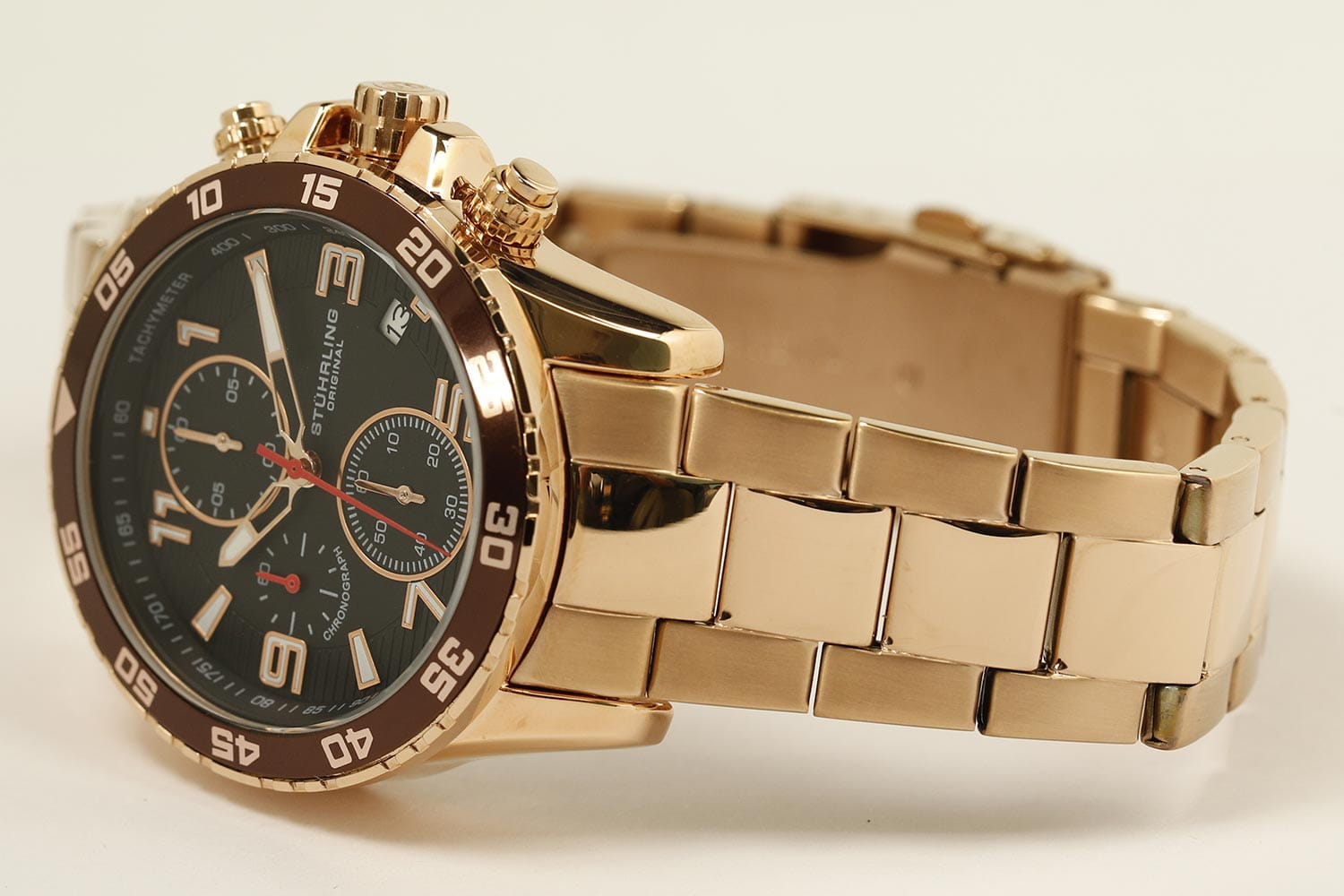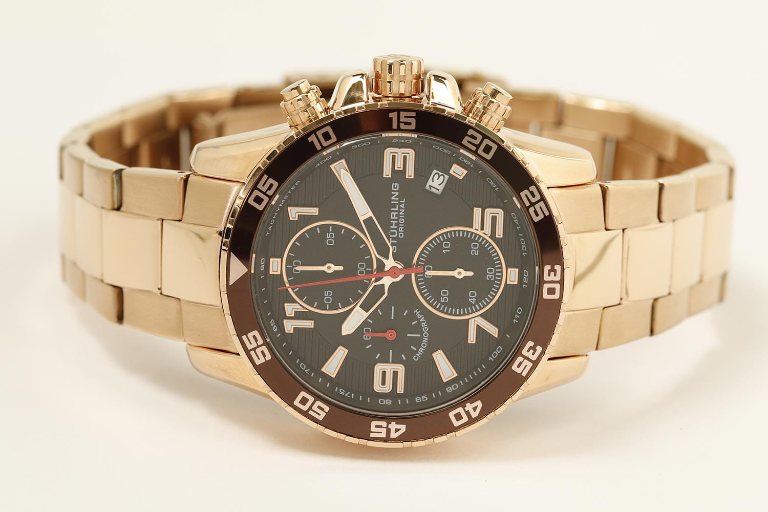 Stuhrling 3957.4 — мощные мужские часы с выразительным спортивным характером и динамичным дизайном. Корпус из нержавеющей стали с PVD-покрытиемPVDУльтратонкое покрытие наносится в технике вакуумного напыления, сочетает в себе нитрид титана особой прочности со слоем золота или оксида хрома. Несёт в себе декоративную или защитную функцию. гармонично сочетается с циферблатом, оформленным рельефным узором и контрастными счётчиками хронографаХронографФункция позволяет измерять отрезки времени с особой точностью: часы, минуты, секунды. Верным признаком хронографа является наличие на циферблате 3 дополнительных окошек-счётчиков.. Широкий безельБезельВнешний ободок, закрепляющий стекло. В спортивных часах так называется поворотное кольцо с делениями на циферблате, выполняет роль таймера – замеряет отрезки времени на шкале. Неподвижный безель – элемент декора. Однонаправленно вращающийся безель на дайверских часах позволяет фиксировать моменты погружения и выныривания на поверхность. с PVD-покрытиемPVDУльтратонкое покрытие наносится в технике вакуумного напыления, сочетает в себе нитрид титана особой прочности со слоем золота или оксида хрома. Несёт в себе декоративную или защитную функцию. подчёркивает брутальный стиль модели, а стрелки и метки с люминесцентным покрытиемЛюминесцентное покрытиеПозволяет считывать показания времени в темноте. Производители наносят на стрелки, часовые индексы, безель или поверхность циферблата светонакопительный состав, дающий холодное свечение. обеспечивают идеальную читаемость в любых условиях. Прочное стекло KrysternaKrysternaKrysterna — инновационное стекло для наручных часов. Благодаря уникальной структуре, Krysterna объединяет ключевые преимущества двух материалов: твердость сапфира, защищающую от царапин, и гибкость минерального стекла, обеспечивающую устойчивость к деформациям. Такая комбинация делает его идеальным решением для часов, подверженных экстремальным нагрузкам, сохраняя при этом оптическую прозрачность. устойчиво к царапинам, сохраняя прозрачность и блеск. Завершает образ стальной браслет с PVD-покрытиемPVDУльтратонкое покрытие наносится в технике вакуумного напыления, сочетает в себе нитрид титана особой прочности со слоем золота или оксида хрома. Несёт в себе декоративную или защитную функцию. и раскладной застёжкойРаскладная застёжкаТакой тип застёжки используется только на браслетах из металла. Она никогда не раскрывается полностью, происходит разделение на 2 и более частей. Раскладывающая застёжка снизит вероятность потери часов к минимуму., гарантирующий комфорт и надёжную фиксацию. Stuhrling — стильная и функциональная модель для уверенных мужчин, ценящих точность и энергию в каждой детали.