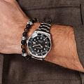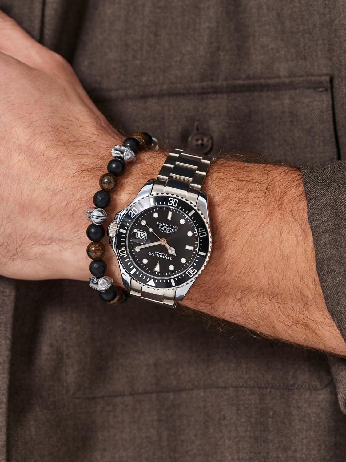Stuhrling 4048.1 — стильные мужские часы в духе морского дайверского дизайна. Глубокий циферблат с радиальным переливом и крупные метки/стрелки с люминесцентным покрытиемЛюминесцентное покрытиеПозволяет считывать показания времени в темноте. Производители наносят на стрелки, часовые индексы, безель или поверхность циферблата светонакопительный состав, дающий холодное свечение. обеспечивают отличную читаемость, вращающийся безельБезельВнешний ободок, закрепляющий стекло. В спортивных часах так называется поворотное кольцо с делениями на циферблате, выполняет роль таймера – замеряет отрезки времени на шкале. Неподвижный безель – элемент декора. Однонаправленно вращающийся безель на дайверских часах позволяет фиксировать моменты погружения и выныривания на поверхность. с PVD-покрытиемPVDУльтратонкое покрытие наносится в технике вакуумного напыления, сочетает в себе нитрид титана особой прочности со слоем золота или оксида хрома. Несёт в себе декоративную или защитную функцию. подчёркивает спортивный характер. Браслет из нержавеющей стали, удобная раскладная застёжкаРаскладная застёжкаТакой тип застёжки используется только на браслетах из металла. Она никогда не раскрывается полностью, происходит разделение на 2 и более частей. Раскладывающая застёжка снизит вероятность потери часов к минимуму. фиксирует часы на запястье. Циферблат прикрыт стеклом KrysternaKrysternaKrysterna — инновационное стекло для наручных часов. Благодаря уникальной структуре, Krysterna объединяет ключевые преимущества двух материалов: твердость сапфира, защищающую от царапин, и гибкость минерального стекла, обеспечивающую устойчивость к деформациям. Такая комбинация делает его идеальным решением для часов, подверженных экстремальным нагрузкам, сохраняя при этом оптическую прозрачность. с высокой стойкостью к царапинам. Надёжный спутник для повседневной настроения и активного отдыха.