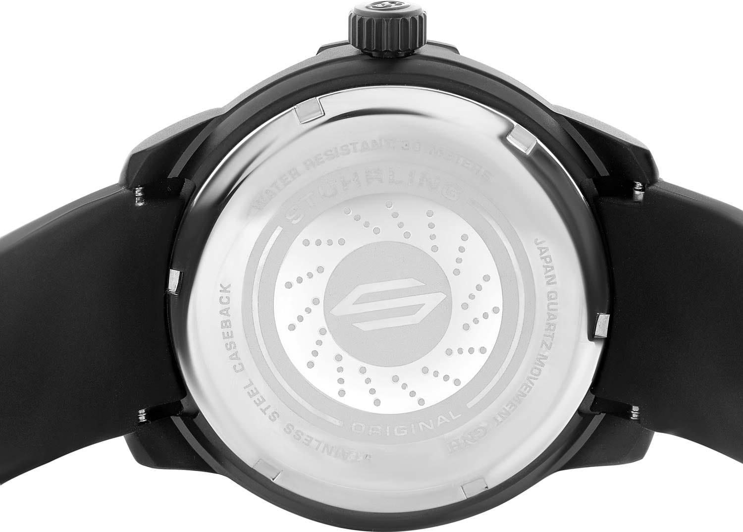 Stuhrling 984.03 — эффектные мужские часы с ярким спортивным характером и футуристичным дизайном. Корпус из нержавеющей стали с чёрным PVD-покрытиемPVDУльтратонкое покрытие наносится в технике вакуумного напыления, сочетает в себе нитрид титана особой прочности со слоем золота или оксида хрома. Несёт в себе декоративную или защитную функцию. придаёт модели выразительный матовый оттенок и повышенную устойчивость к царапинам. Циферблат выполнен в виде стилизованного ротора, где акценты насыщенного цвета создают ощущение движения и энергии. Прочный силиконовый ремешок обеспечивает комфорт и долговечность, а стекло KrysternaKrysternaKrysterna — инновационное стекло для наручных часов. Благодаря уникальной структуре, Krysterna объединяет ключевые преимущества двух материалов: твердость сапфира, защищающую от царапин, и гибкость минерального стекла, обеспечивающую устойчивость к деформациям. Такая комбинация делает его идеальным решением для часов, подверженных экстремальным нагрузкам, сохраняя при этом оптическую прозрачность. надёжно защищает поверхность от повреждений. Stuhrling — часы для тех, кто выбирает технологичный стиль и мощную эстетику в каждой детали.